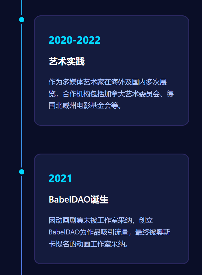 2021年末因为自己和几个编剧朋友写的动画剧集没有工作室采纳而创立了BabelDAO,来给动画剧集吸引流量,后被一个奥斯卡提名的动画工作室采纳了剧集;