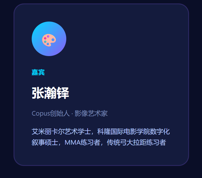 张瀚铎 | Copus创始人,影像/多媒体艺术家,MMA(综合格斗)练习者,传统弓大拉距练习者(非遗),艾米丽卡尔艺术与设计大学电影/多媒体艺术学士,科隆国际电影学院-数字化叙事硕士。