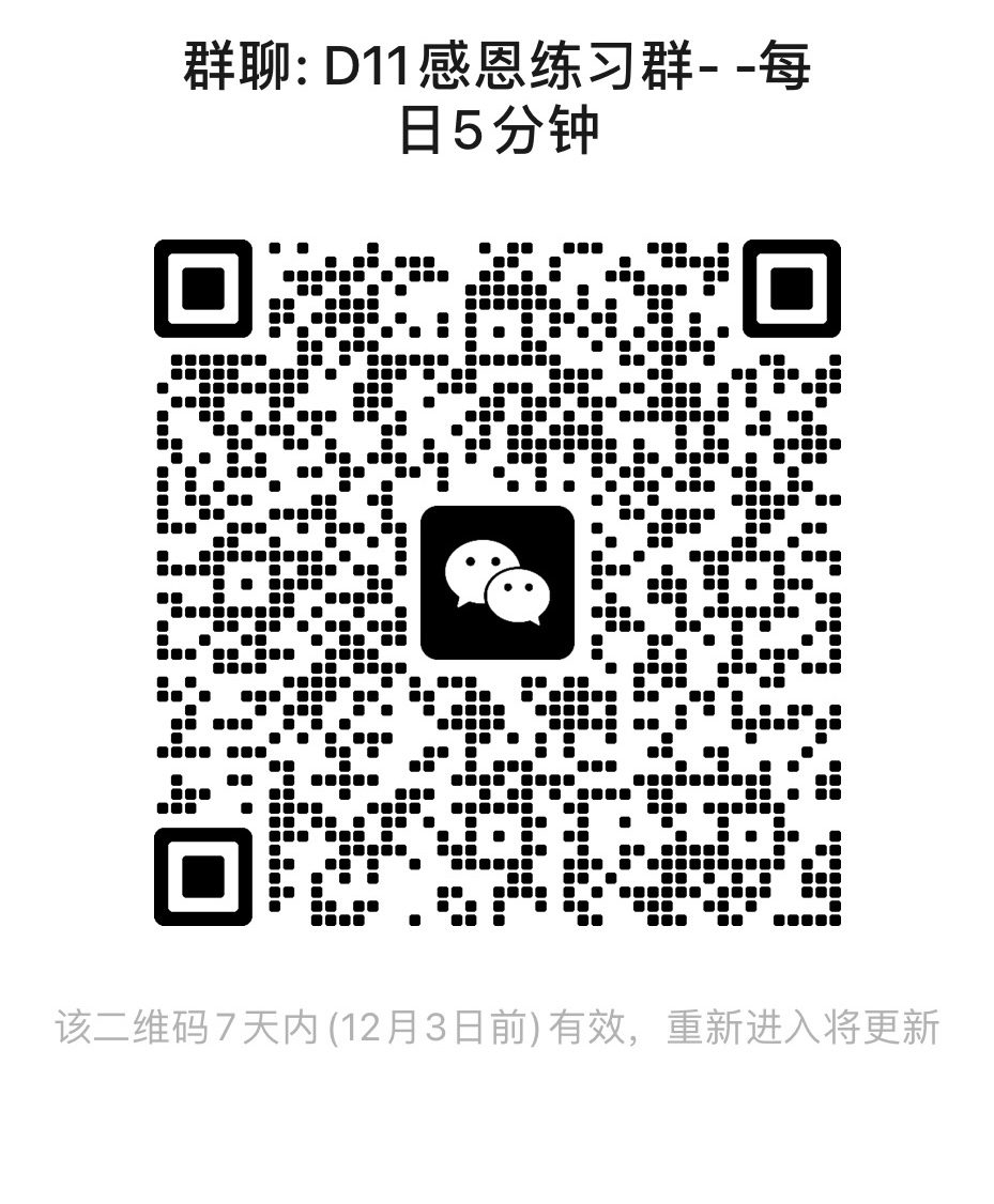 如果大家对感恩练习感兴趣,欢迎扫描下方二维码加入打卡群,2025年最后1个月送给自己一份“向内生长”的礼物,愿大家早日成为自己的人生大女主。