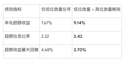 报告将上述两个信号结合,构建了增强型策略:先用“低位放量综合信号”筛选股票池,然后剔除其中触发了“高位放量综合信号”的股票。
