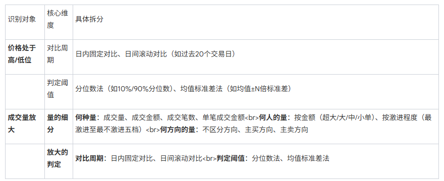 报告详细拆解了“高/低位”和“放量”的定义维度,以实现信号的规模化生产。
