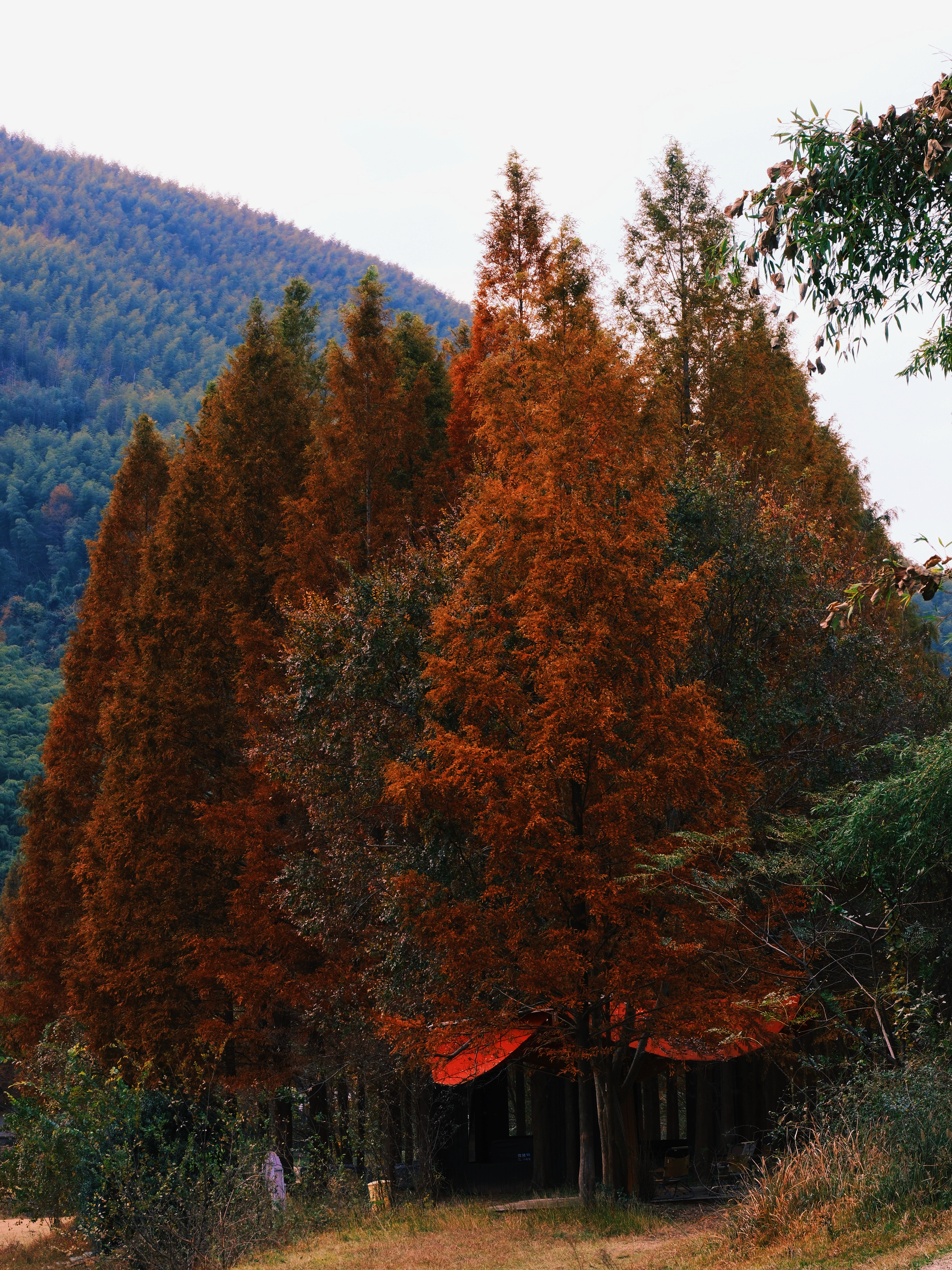 安吉的杉树已经红了,矗立在一片片绿意盎然的竹林前,马路两边,房前屋后,只需要一抬眼,就可以看到大片竹林的绿,跳跃着的杉树的红,还有一些金黄的银杏,灰色黄色绿色相间的法国梧桐。我为之沉迷,着迷,痴迷。