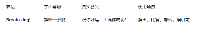 源自西方戏剧界,人们相信直接说“Good luck”会引来嫉妒,因此用反话祝福。