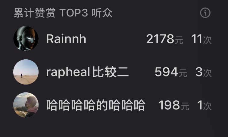💗截至当期,隆重感谢累计赞赏榜单TOP3的听众👑「 Rainnh 」🥈「 rapheal比较二 」🥉「 哈哈哈哈的哈哈哈 」,所有的赞赏都将会作为我们的节目营销支出,让我们彼此可以在茫茫人海中寻找到更多臭味相投的同伴一路向前、无问东西。