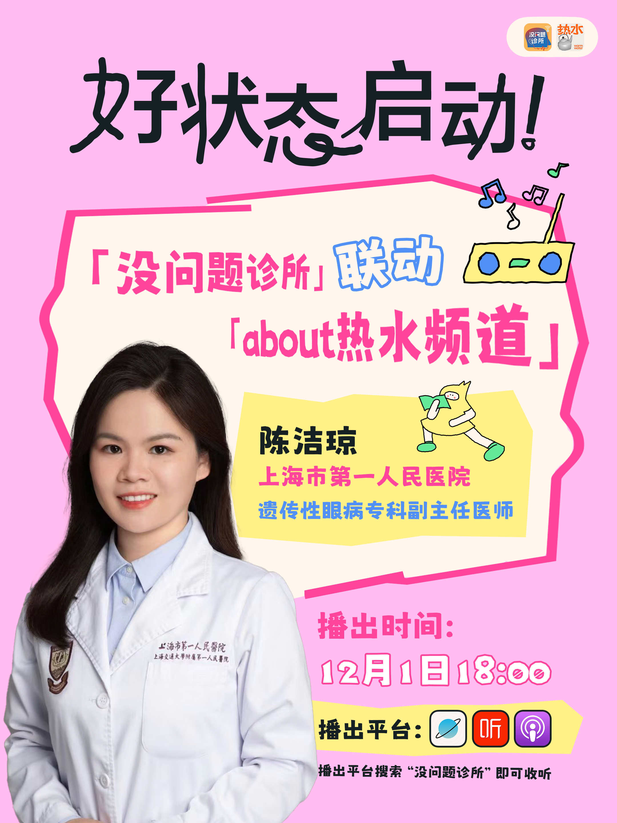 「没问题诊所」已经和「about 热水频道」主播宇野一起邀请三甲医院的专家聊过内分泌、大脑、皮肤和体检,这回宇野说眼睛能不能聊?能!太能了!我一个高度近视马上开始摇人,最后特邀上海市第一人民医院眼科的陈洁琼医生,和我们一起把大家关心的眼部问题掰开揉碎讲清楚——从老花和近视能不能抵消,到眼保健操到底有没有用;从干眼症、结膜炎的应对,到近视手术的适配原则;从黄斑病变的预警信号,到遗传性眼病的识别,甚至连关灯看电视、侧躺玩手机的危害,都给大家讲得明明白白。