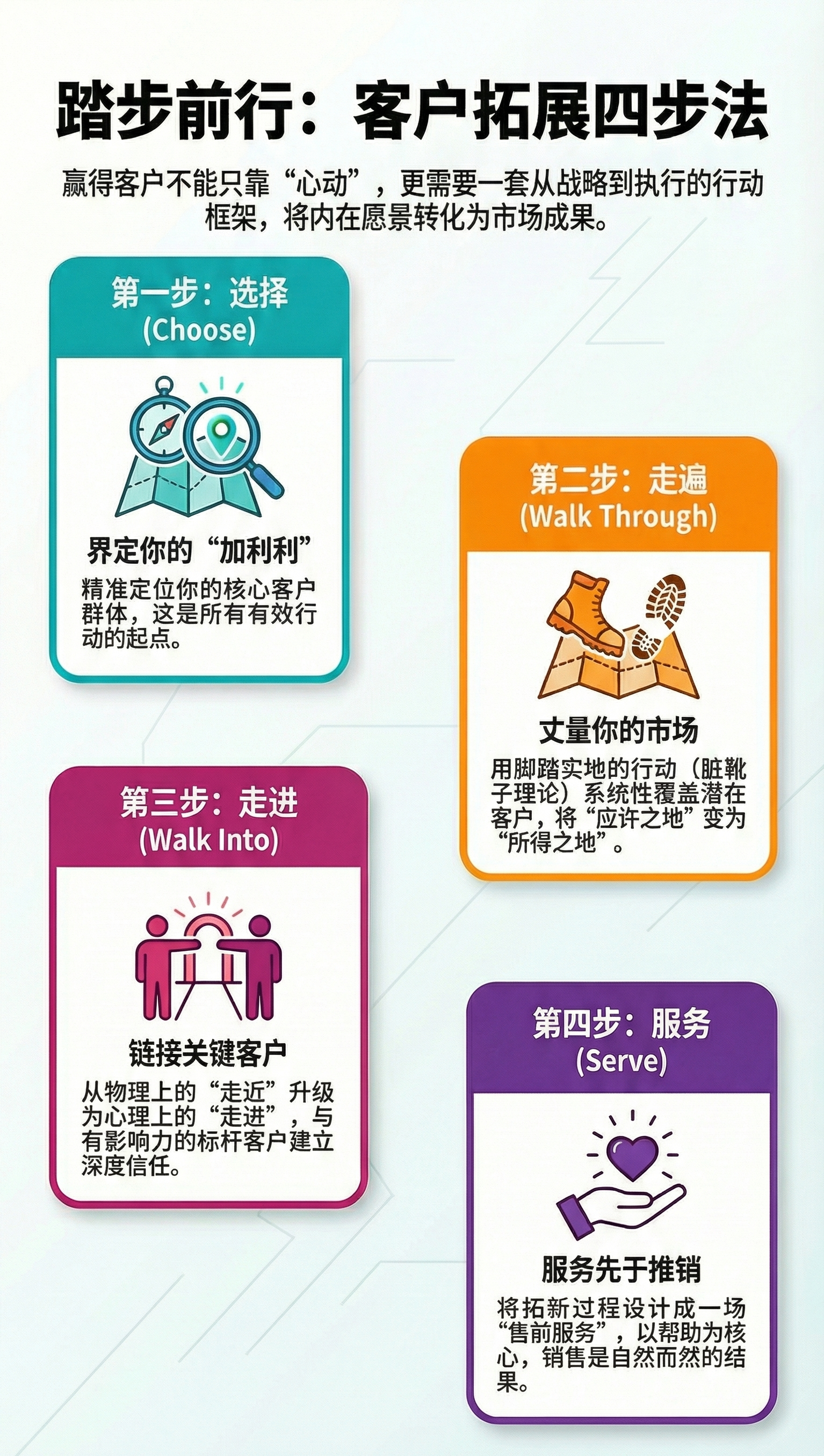 本节目从“走遍加利利”的故事,归纳出如何将使命落地。首先要“选择”,以客户画像锁定精准人群;再“走遍”,以超强行动力触达每一位客户,得到“脚掌所踏”之地的祝福;最后是“走进”,选择成交那些有影响力客户,使之成为你的“标杆客户”。本节目聚焦拓新的关键步骤,进一步学习如何以行动力推进客户拓展以及实现业绩的增长。