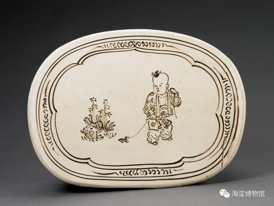 宋代磁州窑白釉黑彩婴戏图枕,石质胎,白釉(或白化妆土上透明釉)地,釉下黑彩绘婴戏图,1988 年北京植物园出土,海淀博物馆藏。