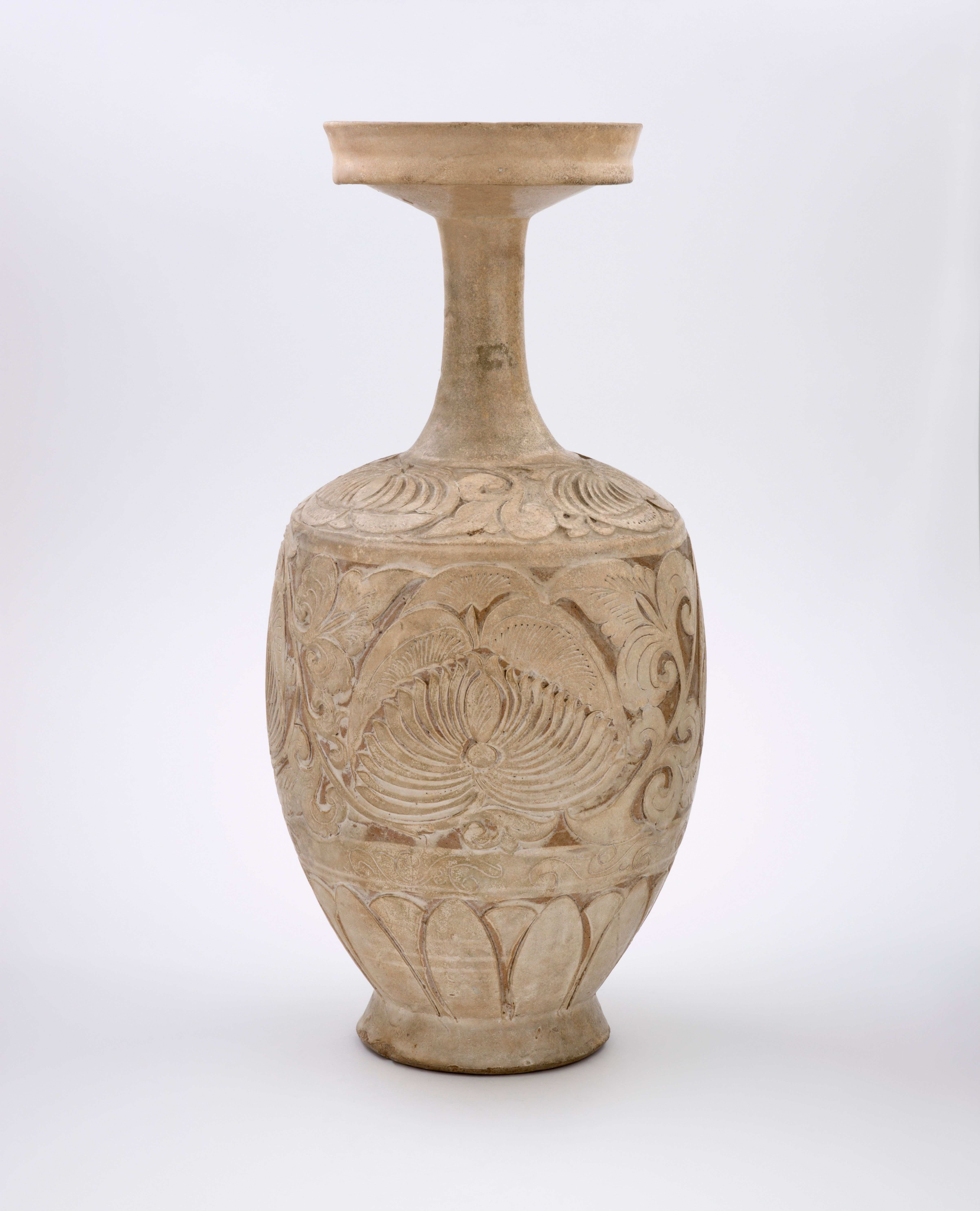 北宋「牡丹卷草纹瓶」,石质胎,白化妆土上刻划牡丹卷草纹后罩透明釉,Indianapolis Museum of Art at Newfields 藏。它几乎是 Cizhou-type 装饰语言的教科书:白色化妆土像宣纸,刻刀让深色胎显露出来,黑白对比从工艺本身生成。