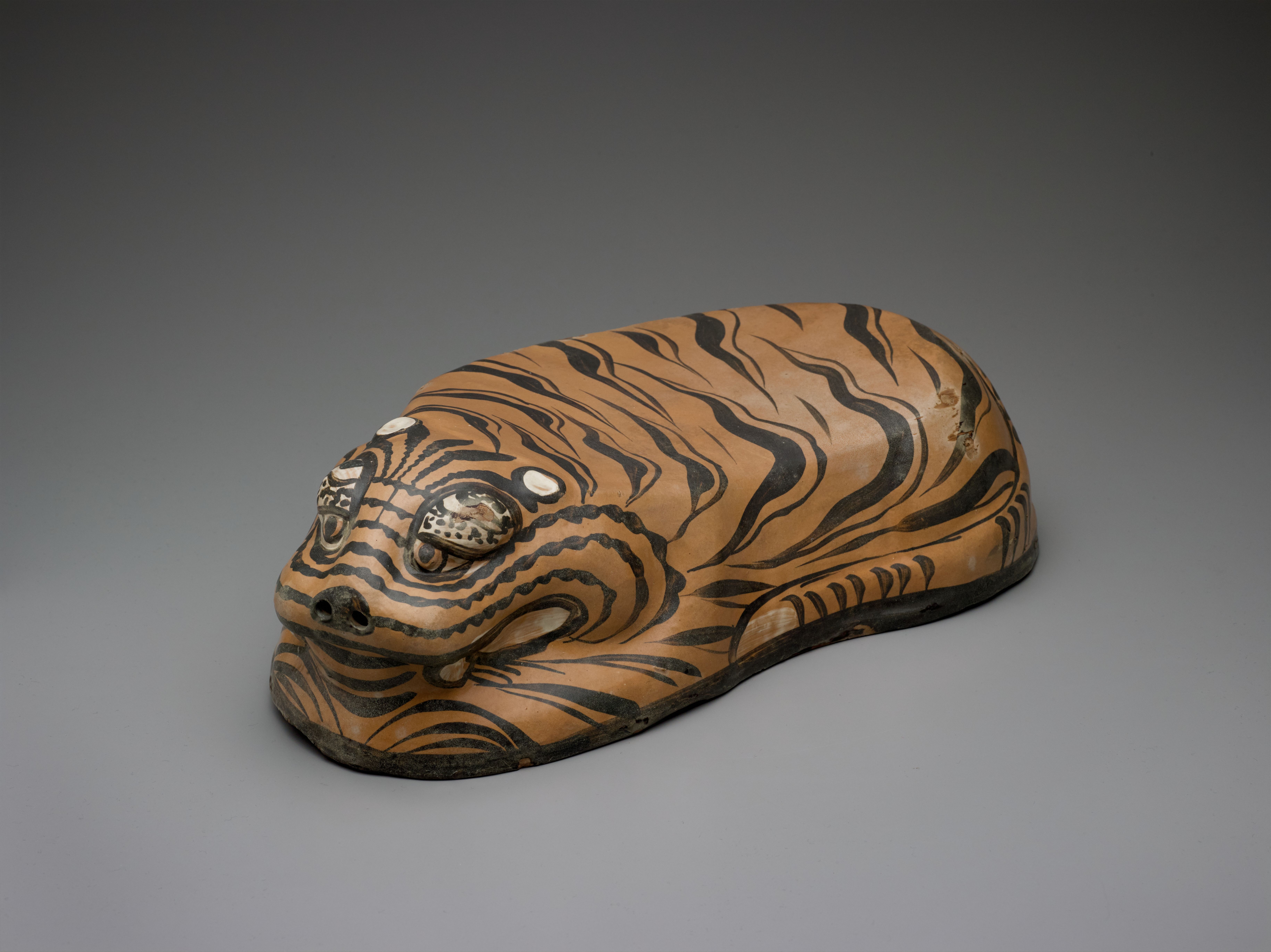 金代 Cizhou Ware Pillow in the Form of a Tiger,1182 年纪年,Brooklyn Museum 藏。虎形塑造,白化妆土上褐、黑釉下彩绘,透明釉。枕底价格铭文,是研究磁州窑商品属性的重要证据。