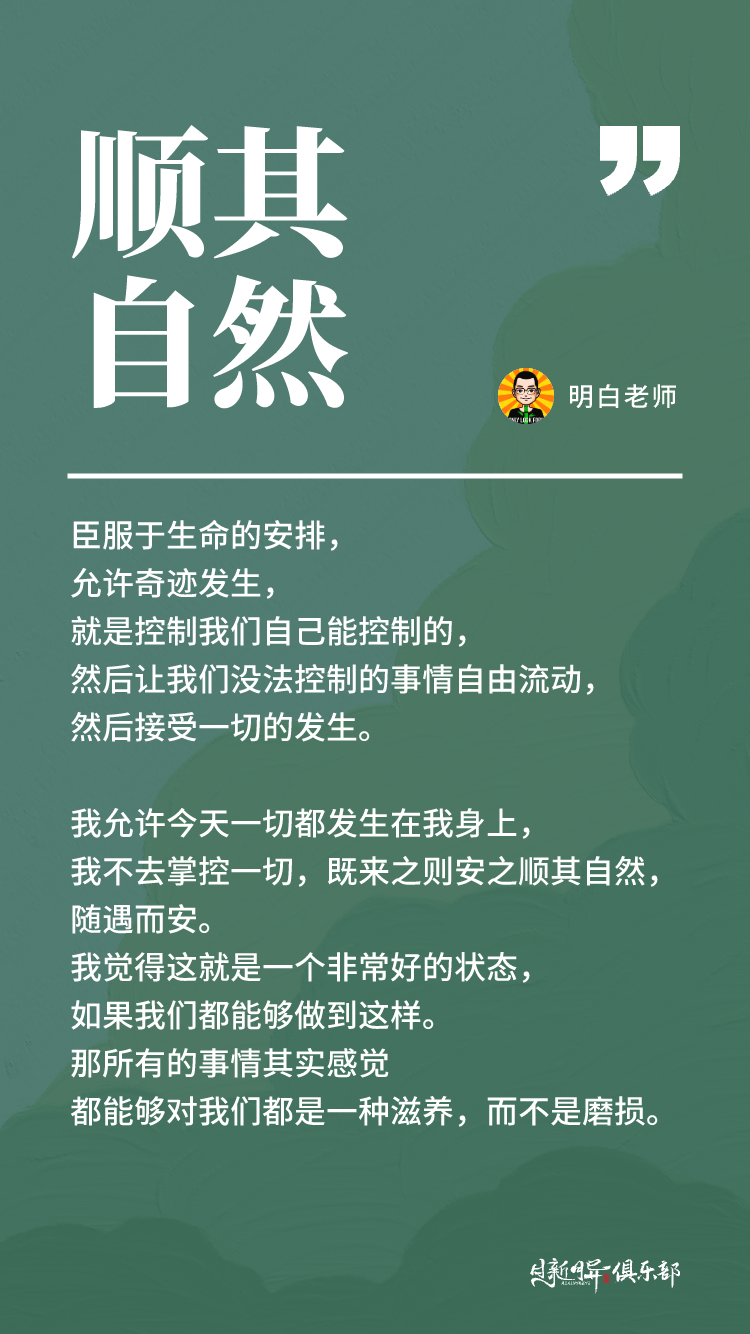 我允许今天一切都发生在我身上,我不去掌控一切,既来之则安之顺其自然,随遇而安。我觉得这就是一个非常好的状态,如果我们都能够做到这样的一些事情。那所有的事情其实感觉都能够对我们都是一种滋养,而不是磨损。