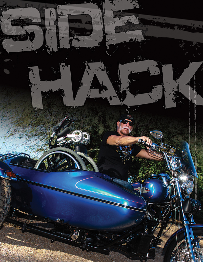 图:Billy Marvin骑在一辆蓝色的挎斗摩托车上,旁边斗里放着他的轮椅