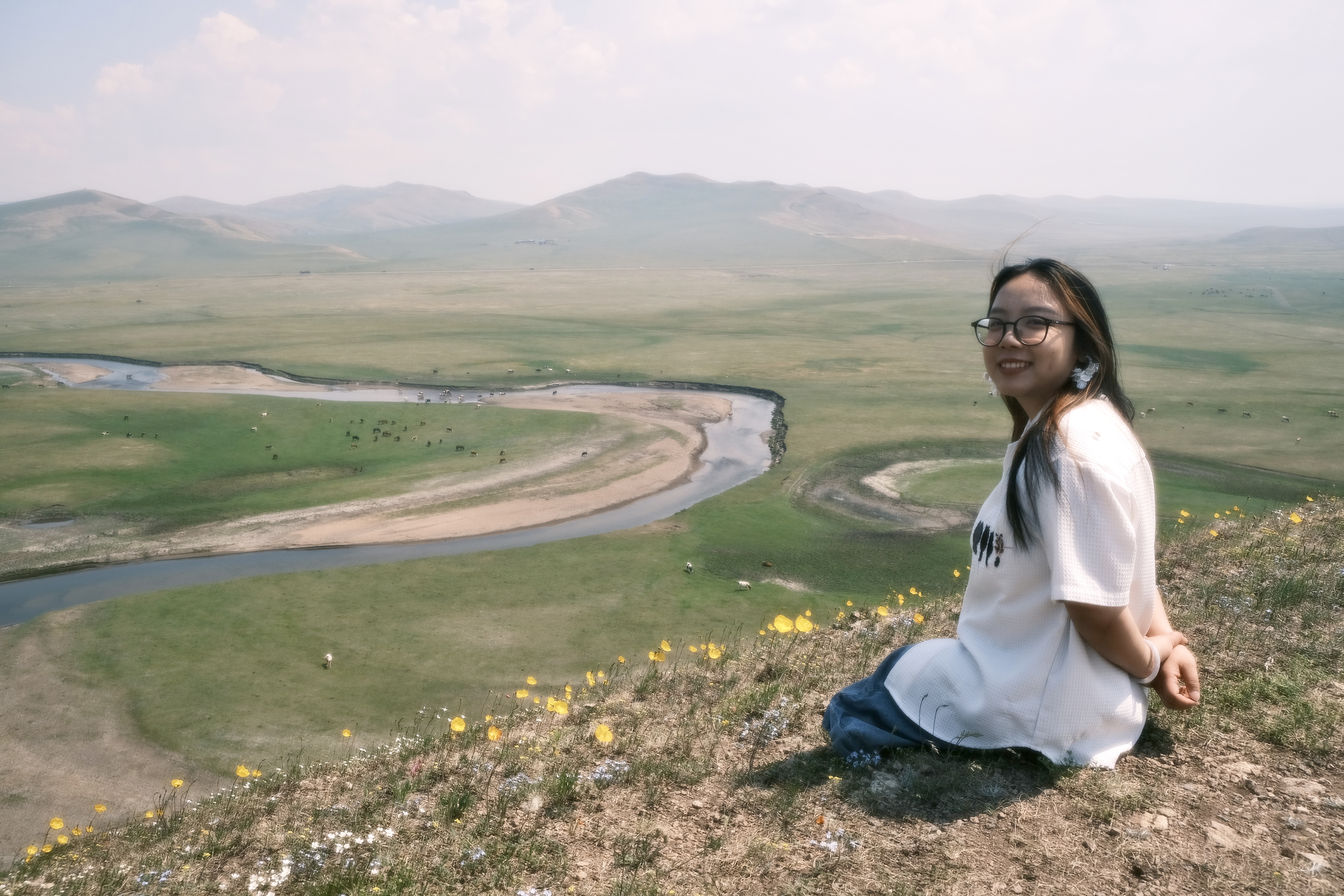 图:梅花身穿白色短袖体恤衫手背后坐在长着小黄花的山坡上,笑容灿烂。