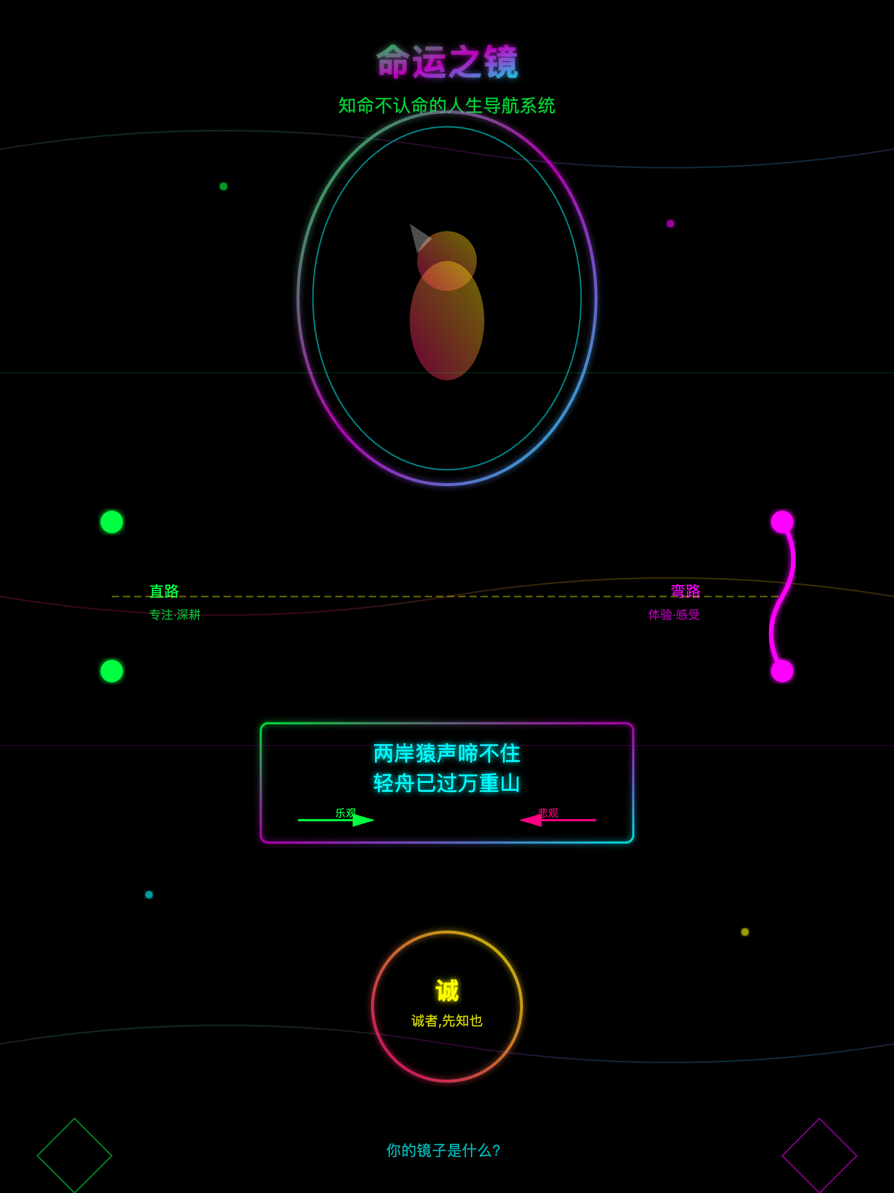 当你真正知道自己想要什么的时候,你就为人生这艘船确立了航向。就像那句老话说:“对于一艘没有方向的船来说,任何方向的风都不是顺风。”只有先做到“诚”,你才有可能谈“知命”。所以,所有这些向内的探索和自省——分辨人生的直路和弯路,用“命运的镜子”看清内在——归根结底,都是为了给自己的人生找一个真正属于你的方向。