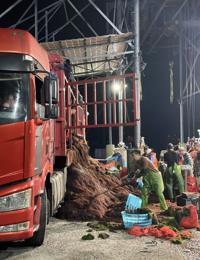 我拍的山脚下的码头上工人正在装运海带(当地的2大海产之一),地点:奇达海上人家餐厅(渔排海鲜)