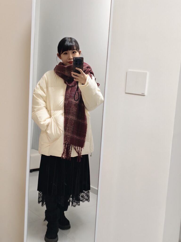 我上身这款是90白鸭绒云朵羽绒服(点击跳转)。三百多。非常轻和软。它是有自带羽绒小围巾款的,那个小围巾是可以拆卸的。不过我自己喜欢配一个绒线的颜色深一点的围巾,会很有秋冬的氛围,而且整个有拉长的效果。