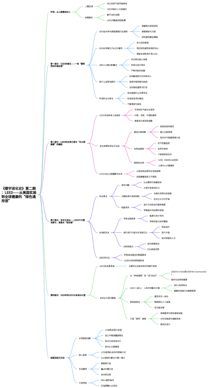 - (00:00-03:00) 开场:从上期办公室空气质量悬念切入,引出LEED主题。