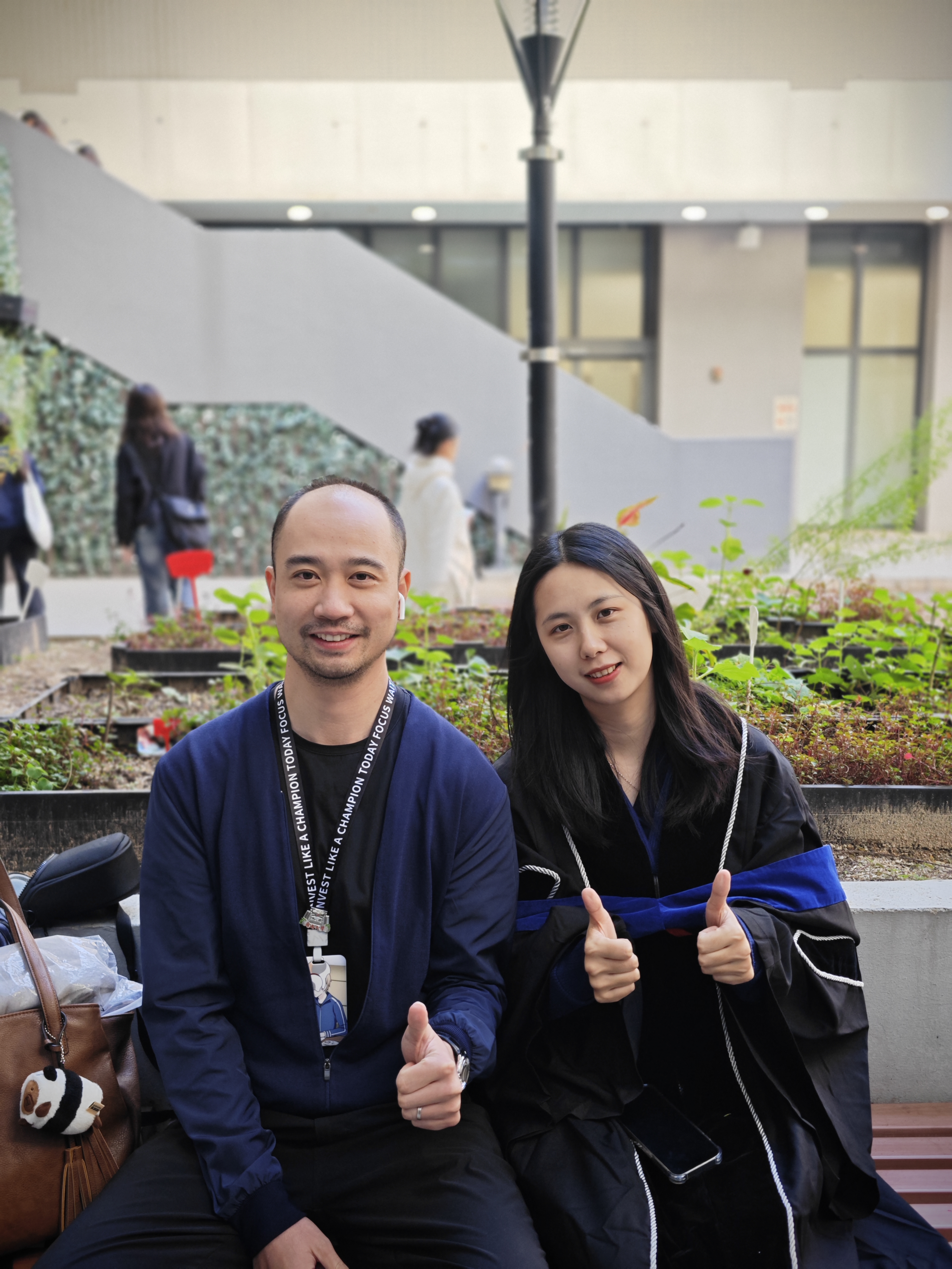 (图1: 2024年11月28日,那天下午,我们在上Accounting课业的间隙,坐在木凳上——去年Jenny在学校第五十五届毕业日期间,23-24MSCRIM)