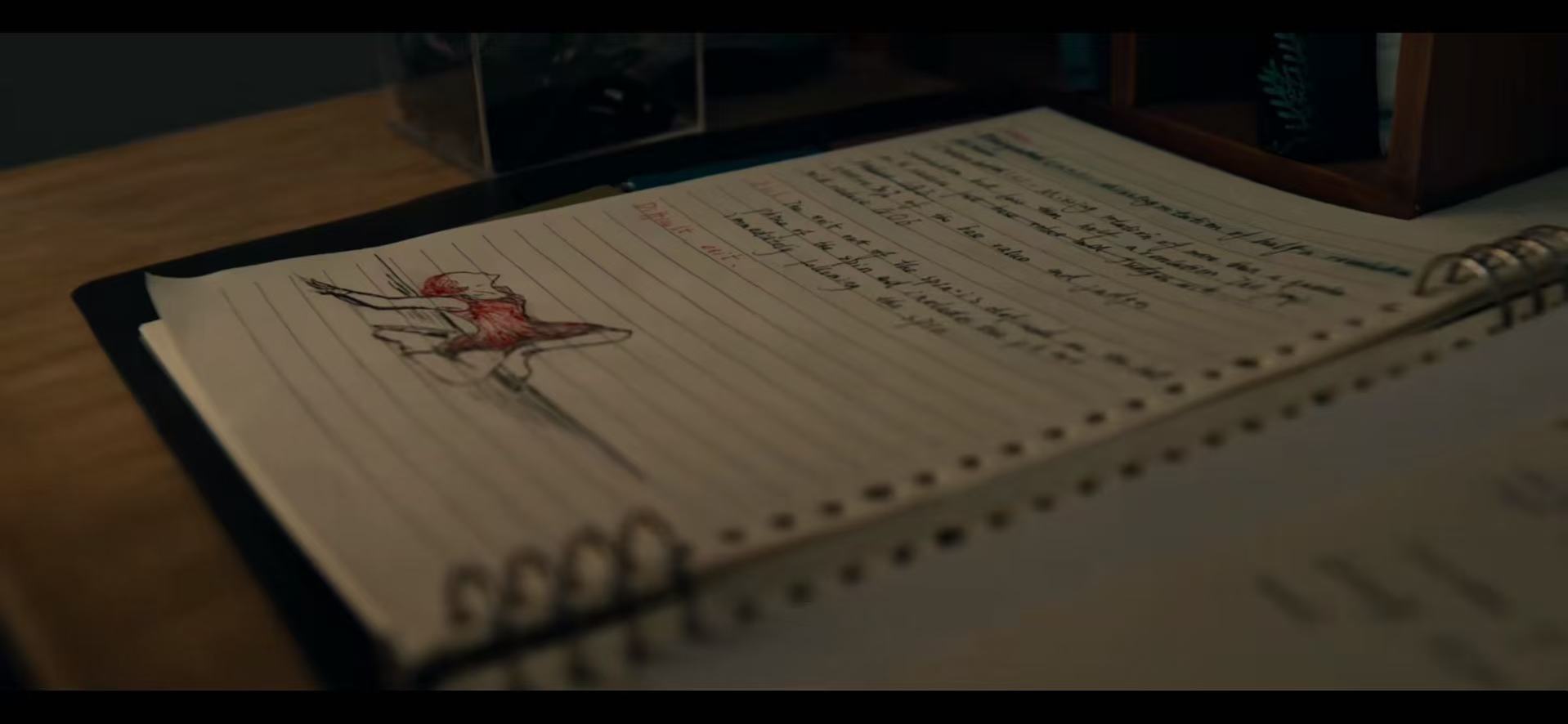 01:34介绍人物关系和故事梗概05:05第二人格“钟灵”第一次出现是什么时候?15:53结局探讨21:22为什么王霜突然在最后一次比赛前才醒悟?27:41红色有什么寓意?33:39钟灵的出现代表江宁是懦弱的吗?36:00后期会聊一聊被这部电影借鉴的《黑天鹅》第一次见面后江宁在本子上画的钟宁: