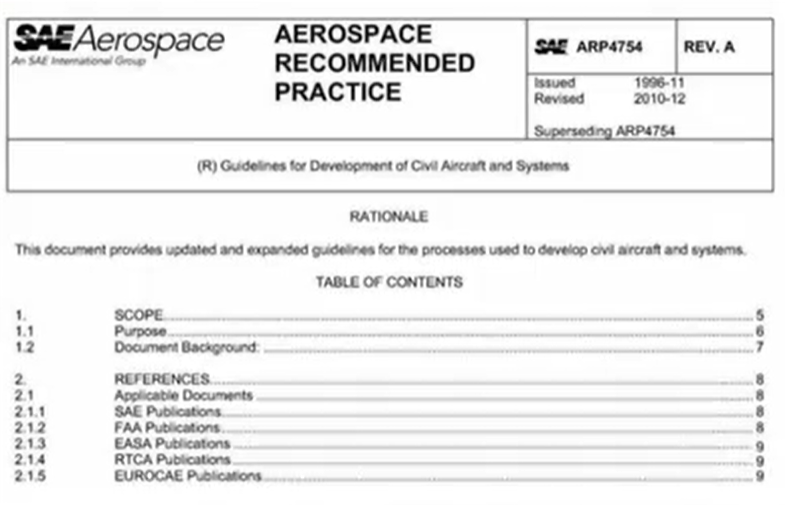ARP(Aerospace Recommended Practice)航空航天推荐实践,由SAE(美国机动车工程师协会)发布,颇具权威性。ARP为飞机的开发运行维护等各个方面提供了实践性的指南,也是一种系统化的开发流程和安全评估工具。