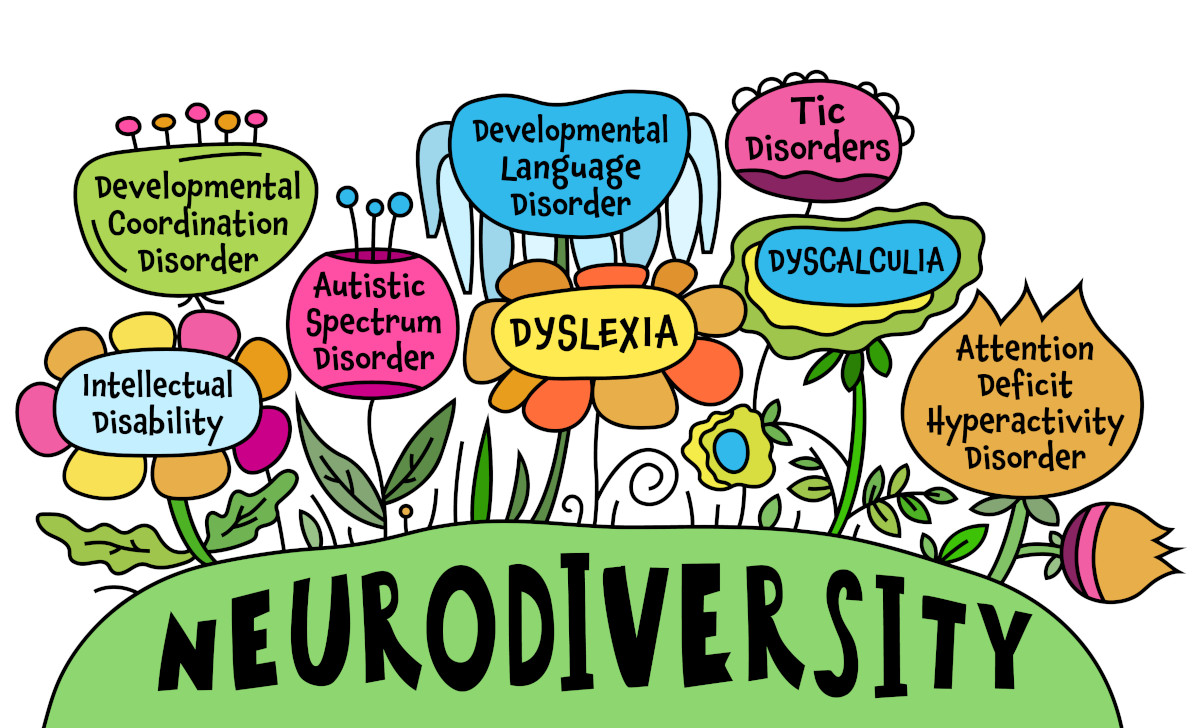 (神经多样性Neurodiversity不是病,而是每个人大脑运行的方式不同。图中列出了各种不同的表现,如Autistic Spectrum Disorder自闭症,Attention Deficit Hyperactivity Disorder注意力缺陷障碍,简称ADHD, Dyslexia阅读障碍等等)