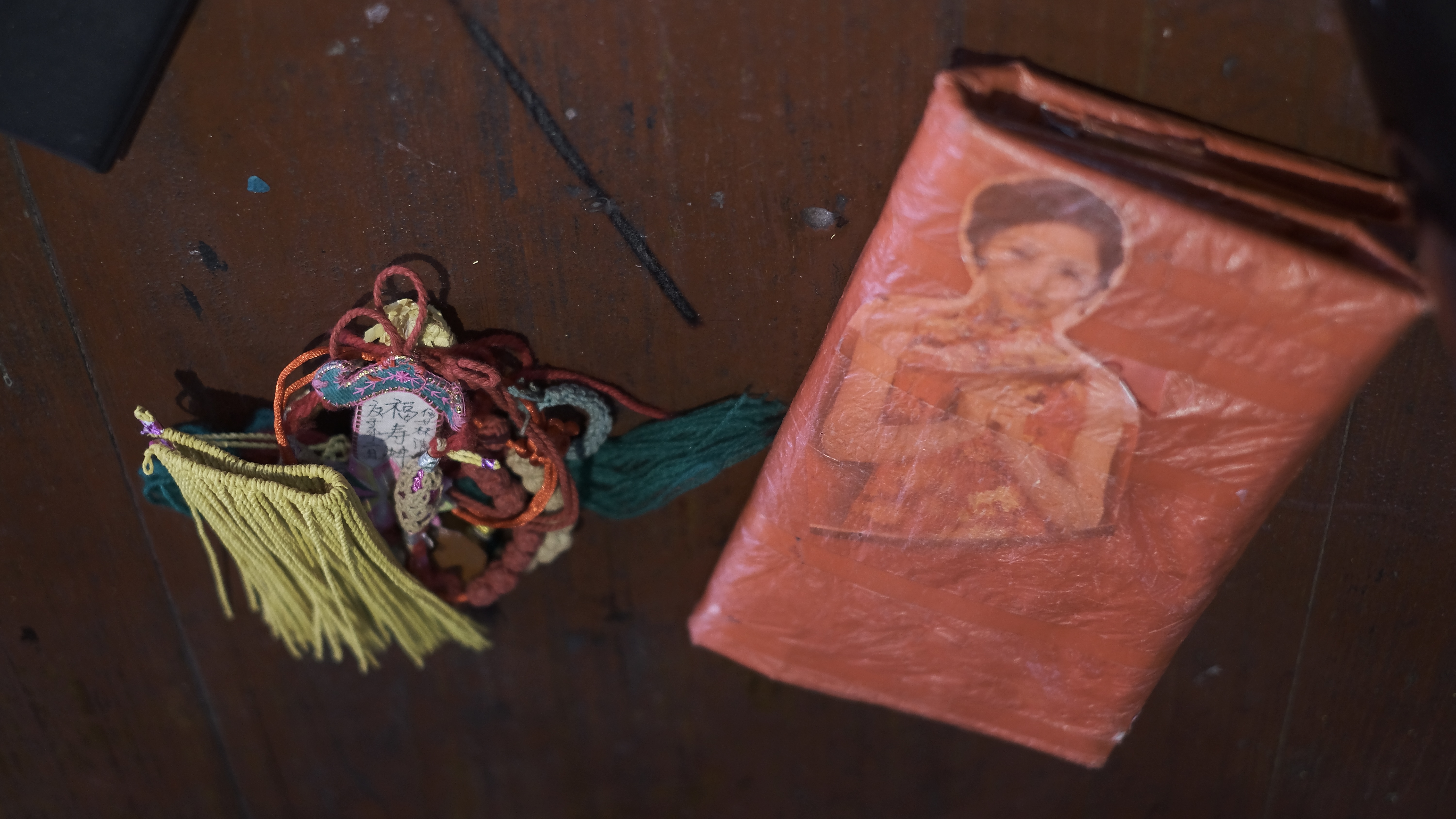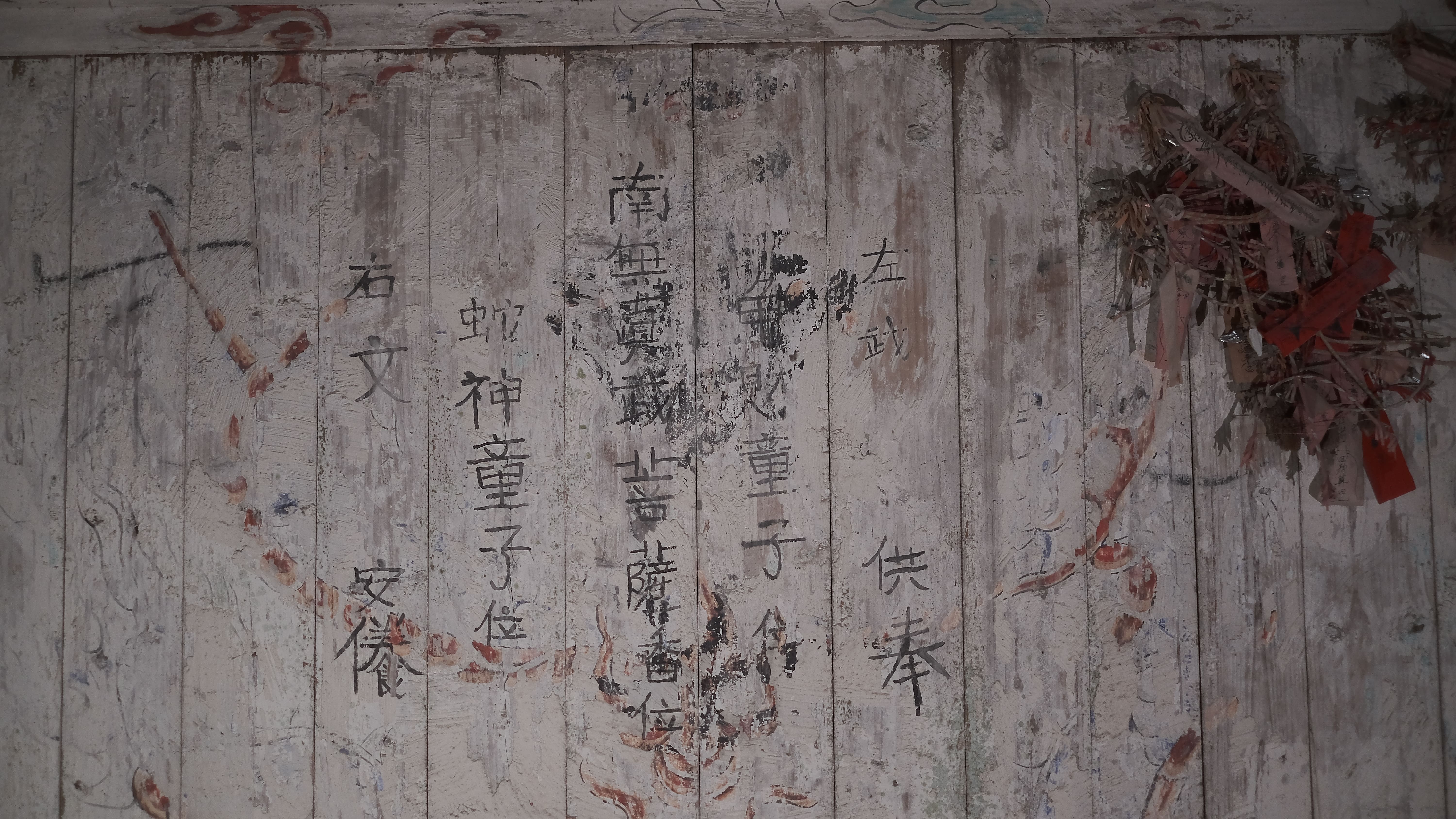 接龙桥旁的无名小庙中,没有神像,但供奉着用文字所书写的神明「走神」途中,偶见供“空”。