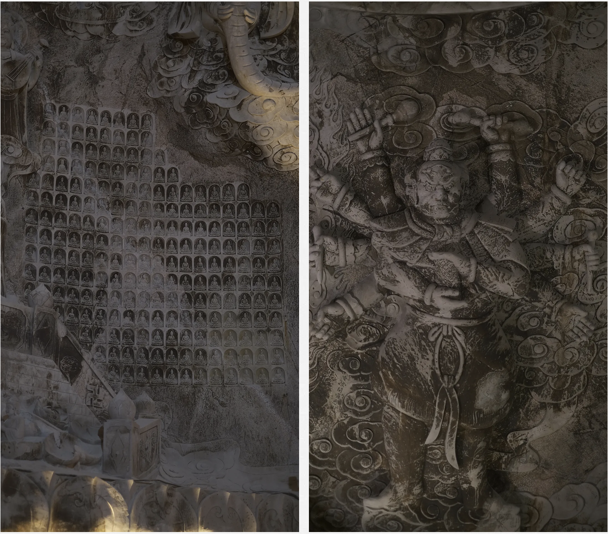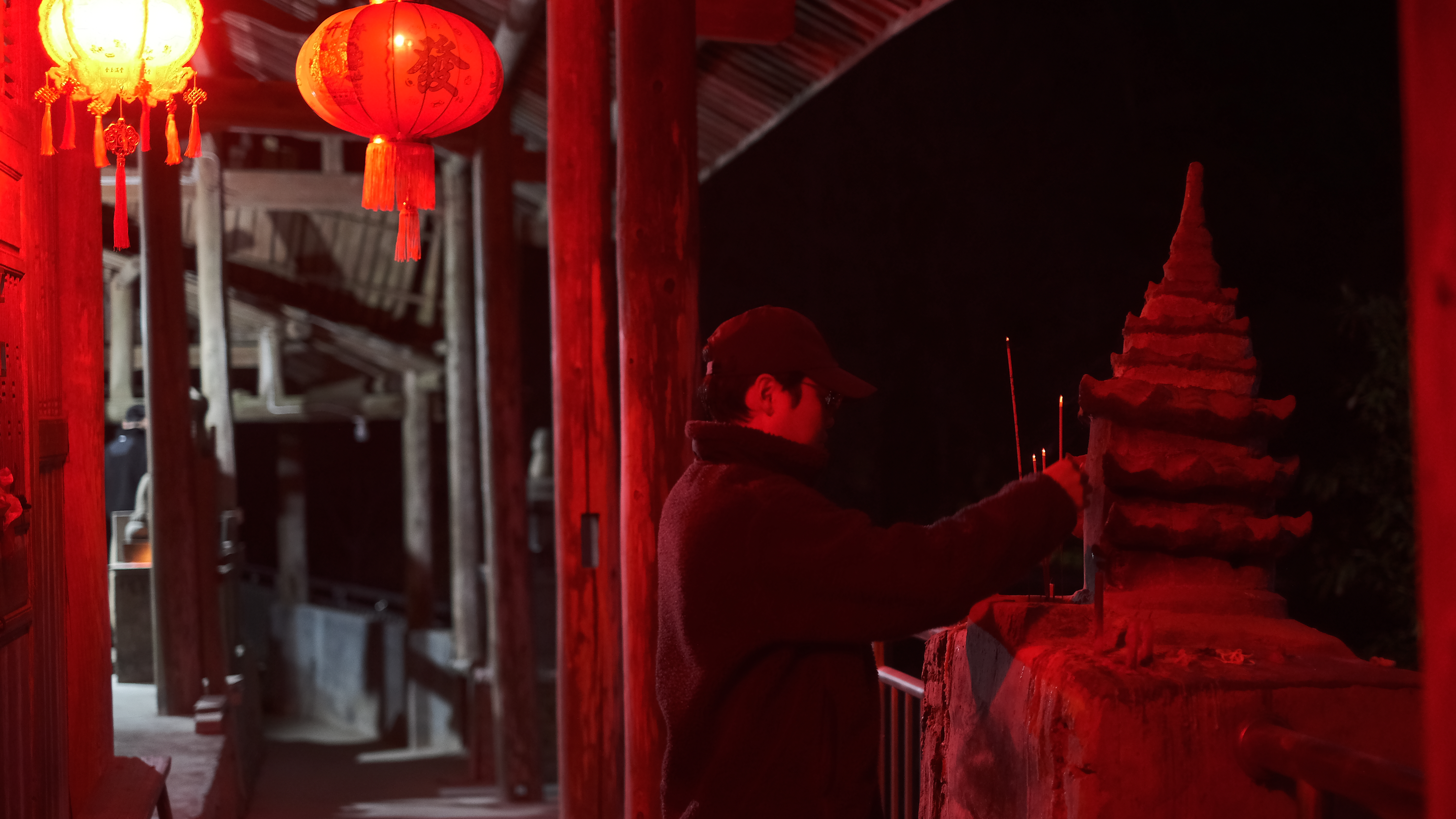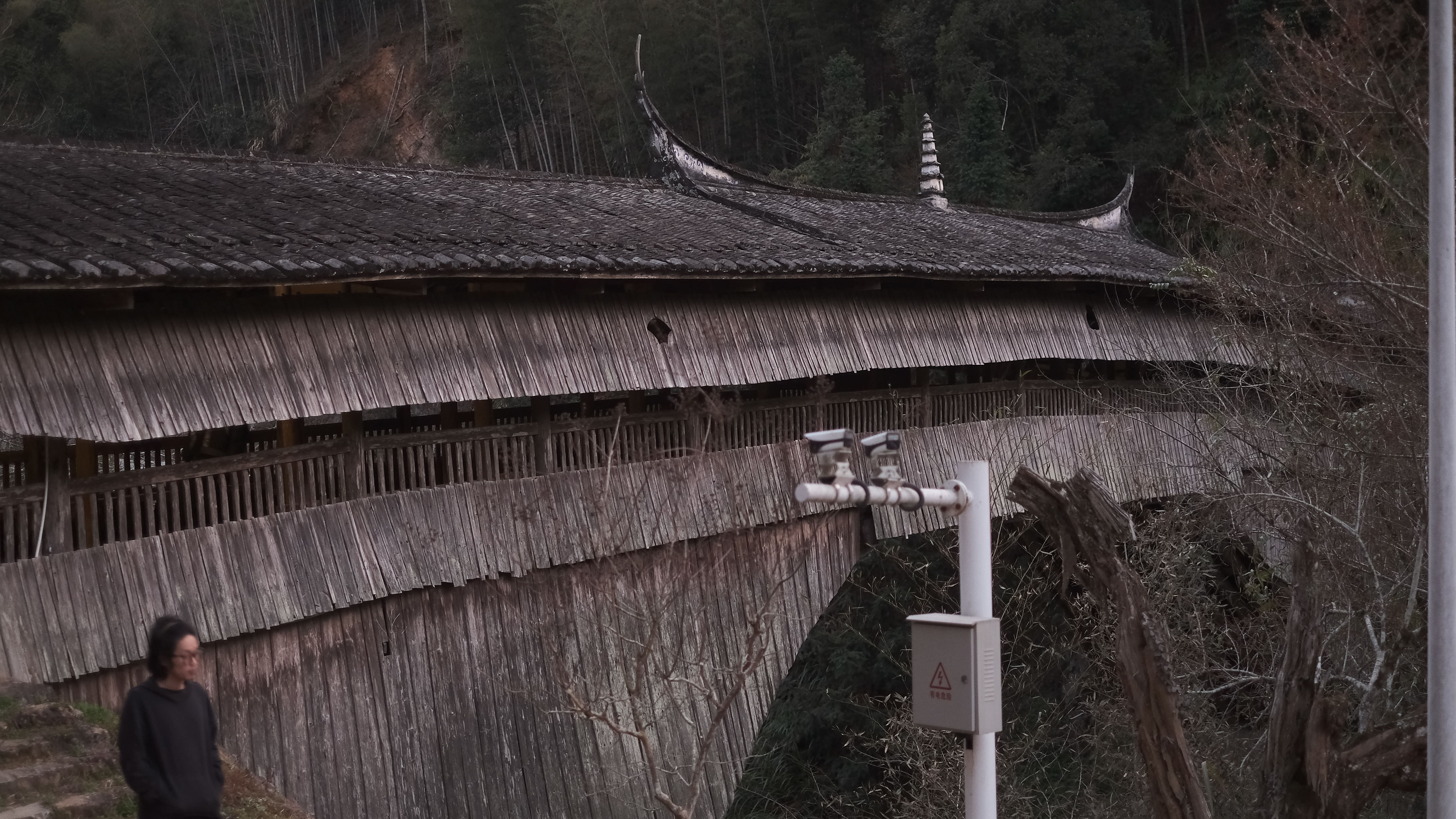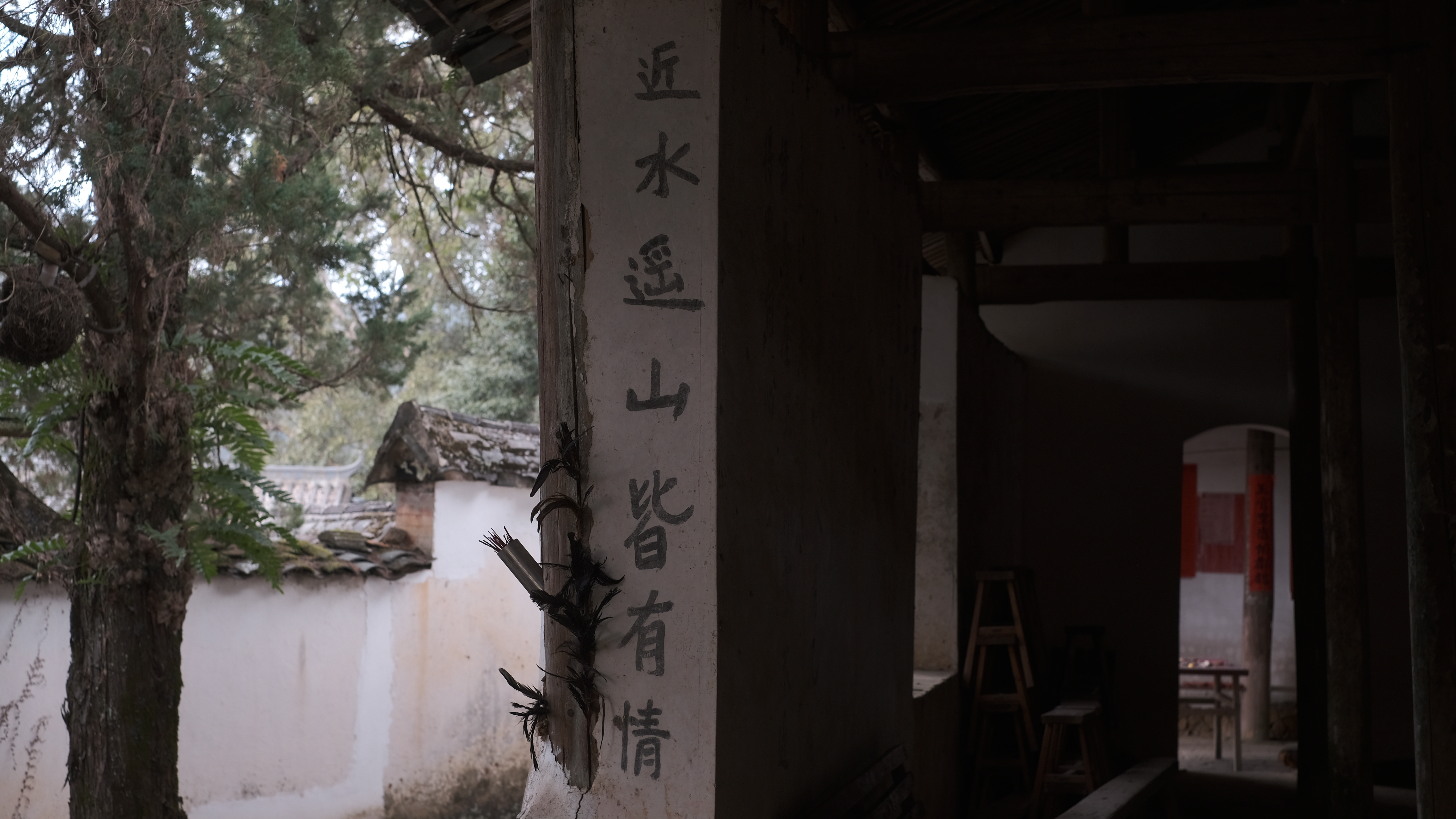 “看明弘治年间建造的值庆桥回程偶遇接龙桥与接龙寺,非常惊喜。落暮时分,廊桥上的神明已经被请到路边,只留下文字的形象;依岸而起的接龙禅寺尚有烛光摇曳,进入室内仿佛是一户人家,厨房厕所楼梯俱全,再往深处是一间连一间的神龛,韦驮菩萨与弥勒菩萨一坐一立靠着河,大雄宝殿与幽冥宝殿左右相邻,虎神虎视眈眈,笋神冉冉而上,其他神明祖师藏在更幽暗处难以相认。天顶对联如沐春风“日出天中东雷南电西北雨,月沉水底前波后浪左右风”。——贺勋