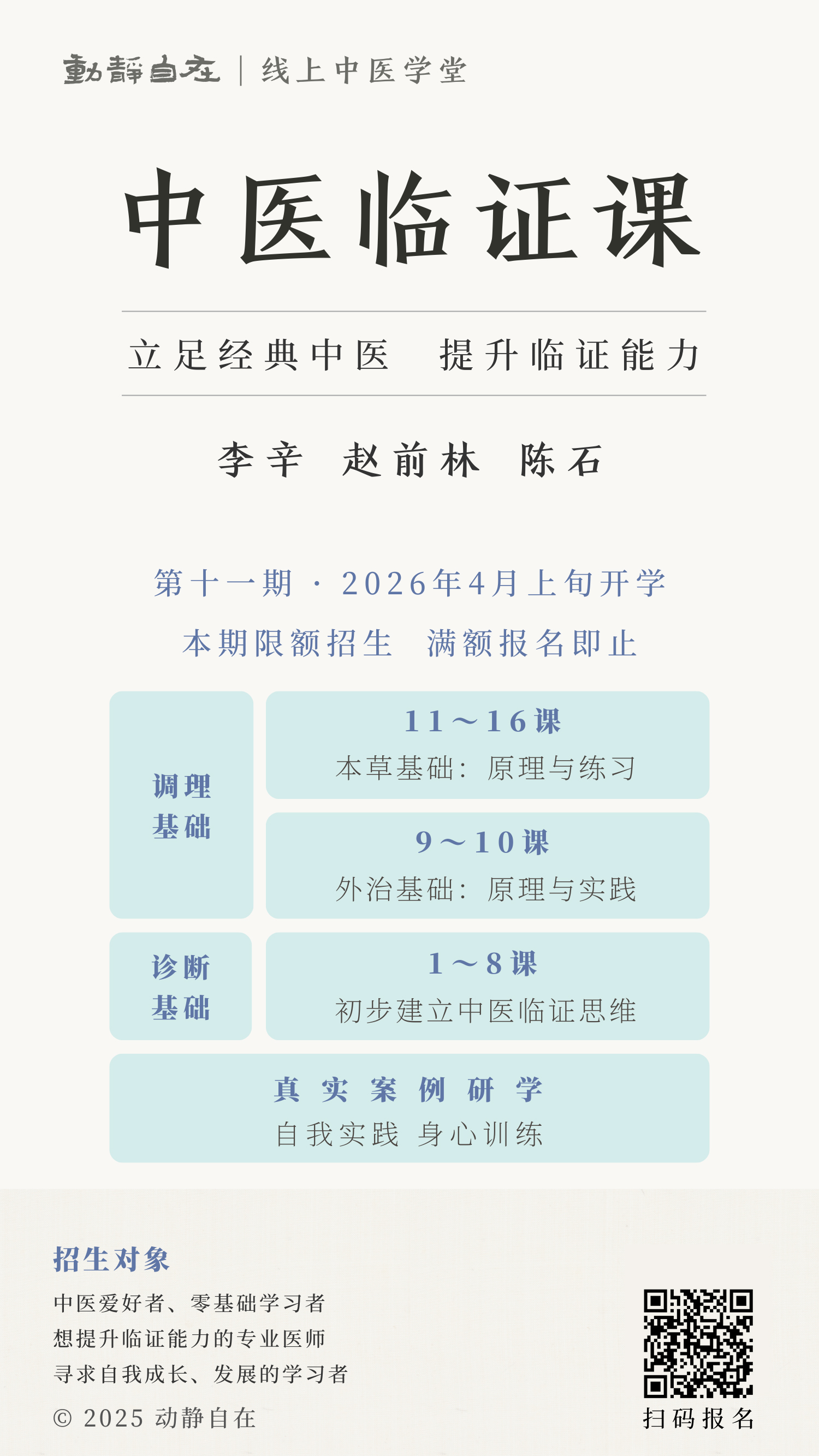 《中医临证课》是李辛老师主讲的入门中医课,适合零基础、对中医感兴趣的同学。课程的教学目标是:为学员们建立清晰的中医理路,初步养成中医诊断能力,打下外治和本草基础,培养身心训练的习惯,实践所学进行自调。目前正在招生中。