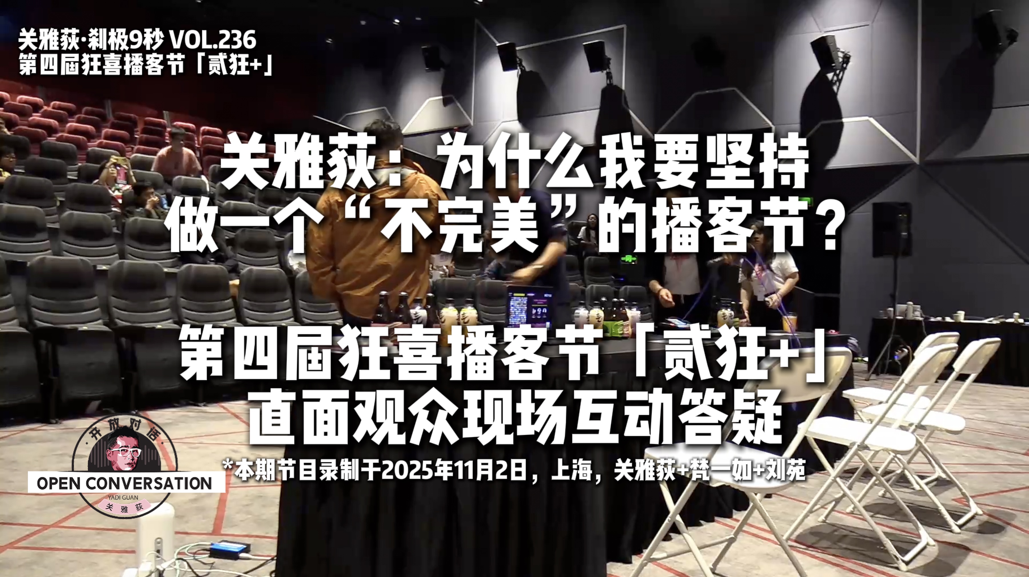 本期内容是“狂喜播客节”创始人关雅荻、联合创始人梵一如、志愿者代表刘苑,一起与狂喜播客节的核心观众面对面的一场坦诚对话。作为一场在多厅影院内、两天九厅同步进行、超过100场内容的“反常规”活动,关雅荻将其定义为“一人社会企业”和一场“社会实验”,而非单纯的商业展会。他坦然面对活动的“不完美”,并以此为切口,探讨了狂喜播客节的底层逻辑与第五届的进化方向。