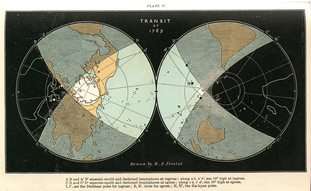 1769 年库克船长赴塔希提观测金星凌日的任务,其顺带勘测新西兰、发现澳洲东海岸的经历;拉朗德汇聚全球数据算出地日距离,引出天文单位(1.5×10^8 千米)的定义。