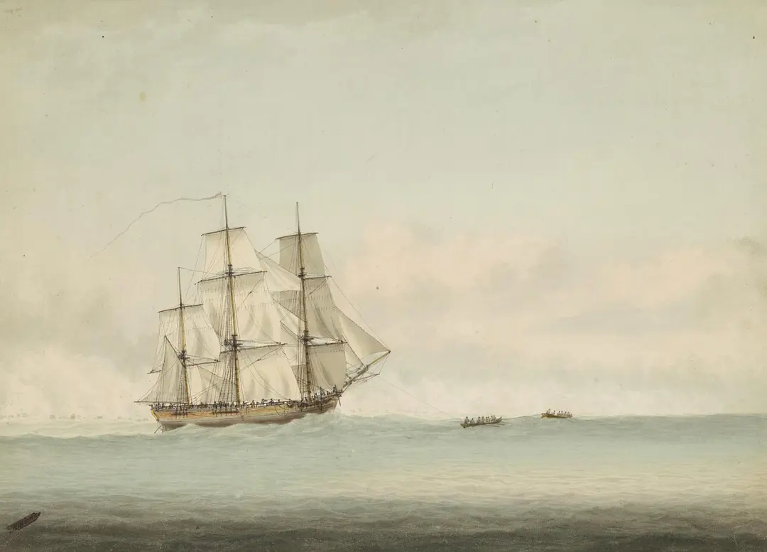 库克船长驾驶“奋进”号驶离澳大利亚↑