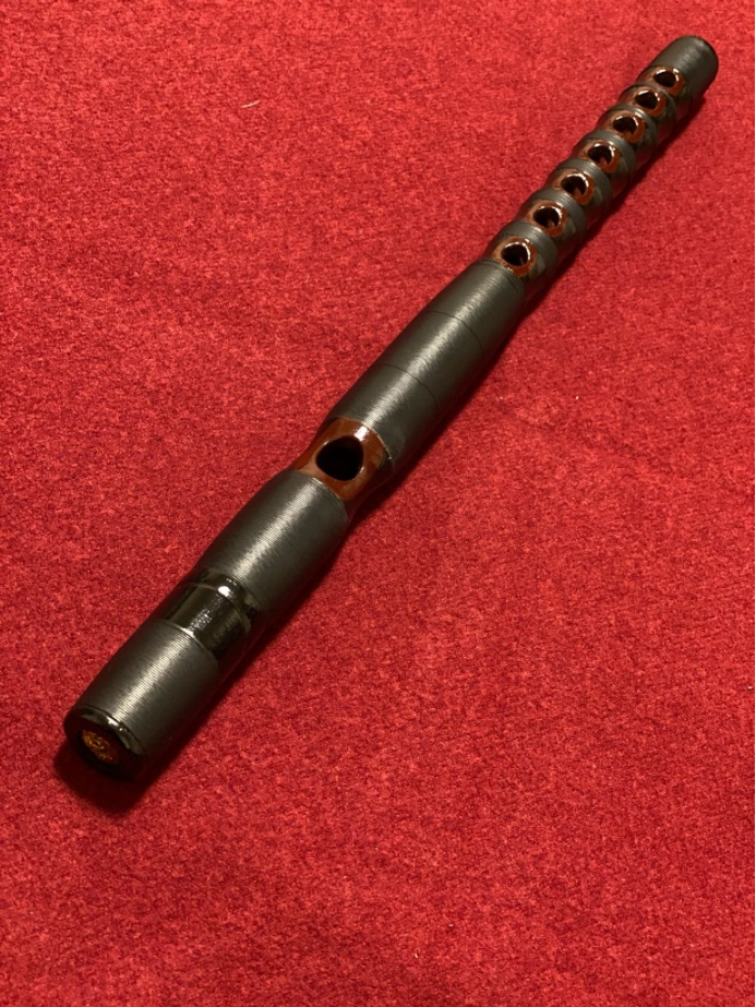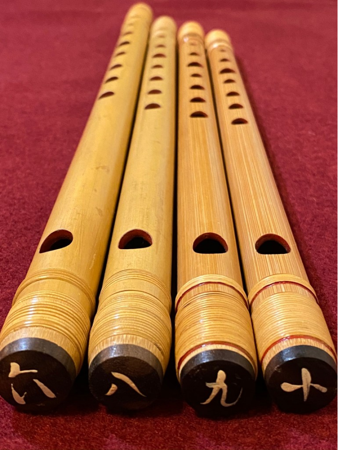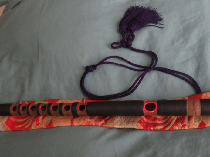 龙笛 能管:也叫作日本高音笛。能管传统上由烟熏竹或烧竹制成。能笛内部有一个称为“喉部”(nodo)的管径限制装置,宽度约为2-3毫米,它可以帮助演奏者吹奏高音。下图就可以看到被插入的那个小的细管,缩小了内径,可以吹奏高音。