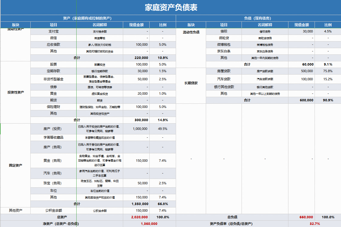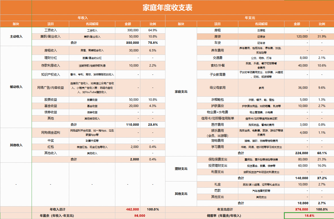 如果真想理清楚自己的财务健康状况,看看在年初的时候定下的存钱目标,到底达成了没有,储蓄率是多少,负债是多少,那今天就可以自己动手,做一份真正清晰、真实的,专属于你个人或家庭的财务年报