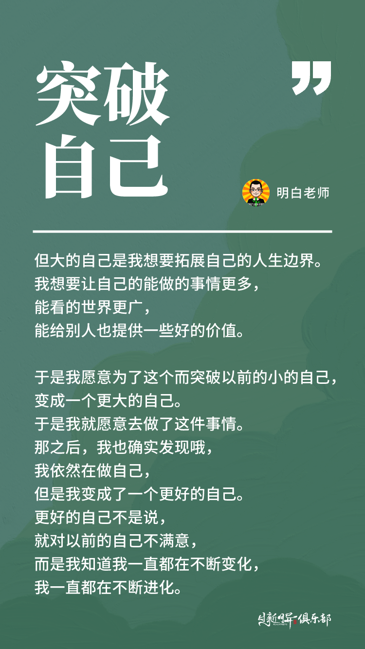 但这种我可能它就是一种比较小的,比较窄的,呃做自己。更好的一种做自己,它叫做我知道自己是谁,我知道自己想要什么,我知道自己的未来想获得什么样的成就,那我愿意为此去突破自己,让自己的做自己变得更大,让自己克服恐惧,积极主动去克服去行动去反馈。