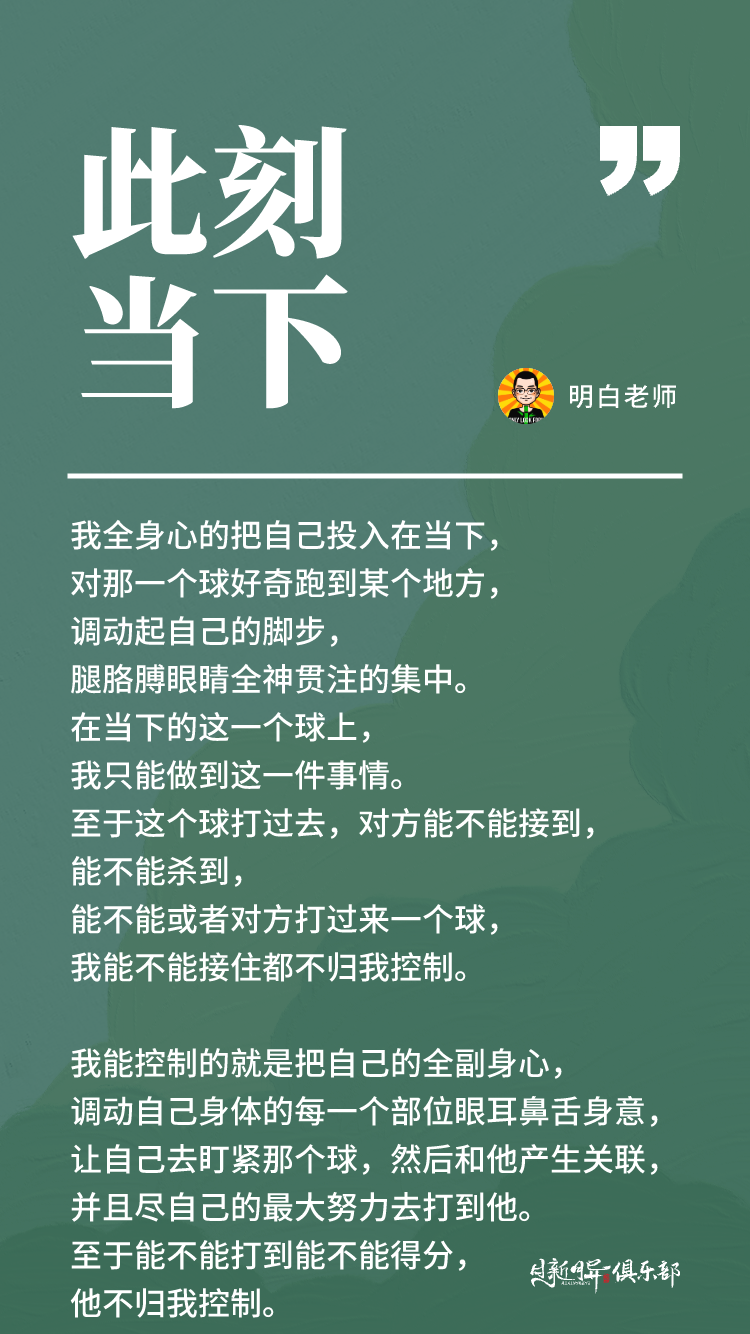 我能控制的就是把自己的全副身心,调动自己身体的每一个部位眼耳鼻舌身意,让自己去盯紧那个球,然后和他产生关联,并且尽自己的最大努力去打到他。至于能不能打到能不能得分,他不归我控制,我觉得这是一个生活非常重要的一个哲学。
