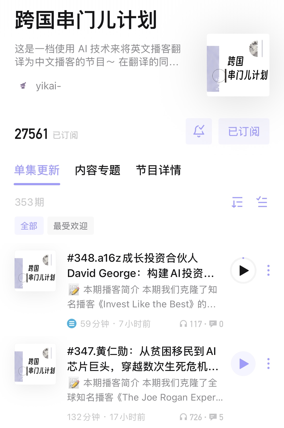 ▶️“跨国串门儿计划”是一档专注于让中文听众、无障碍欣赏全球优质外语播客的节目。通过先进的AI声纹克隆技术,他们不仅将内容翻译为中文,还完美保留了主持人和嘉宾的独特声音,为听众呈现全球顶尖的AI、财经、健康与科技领域精品内容。