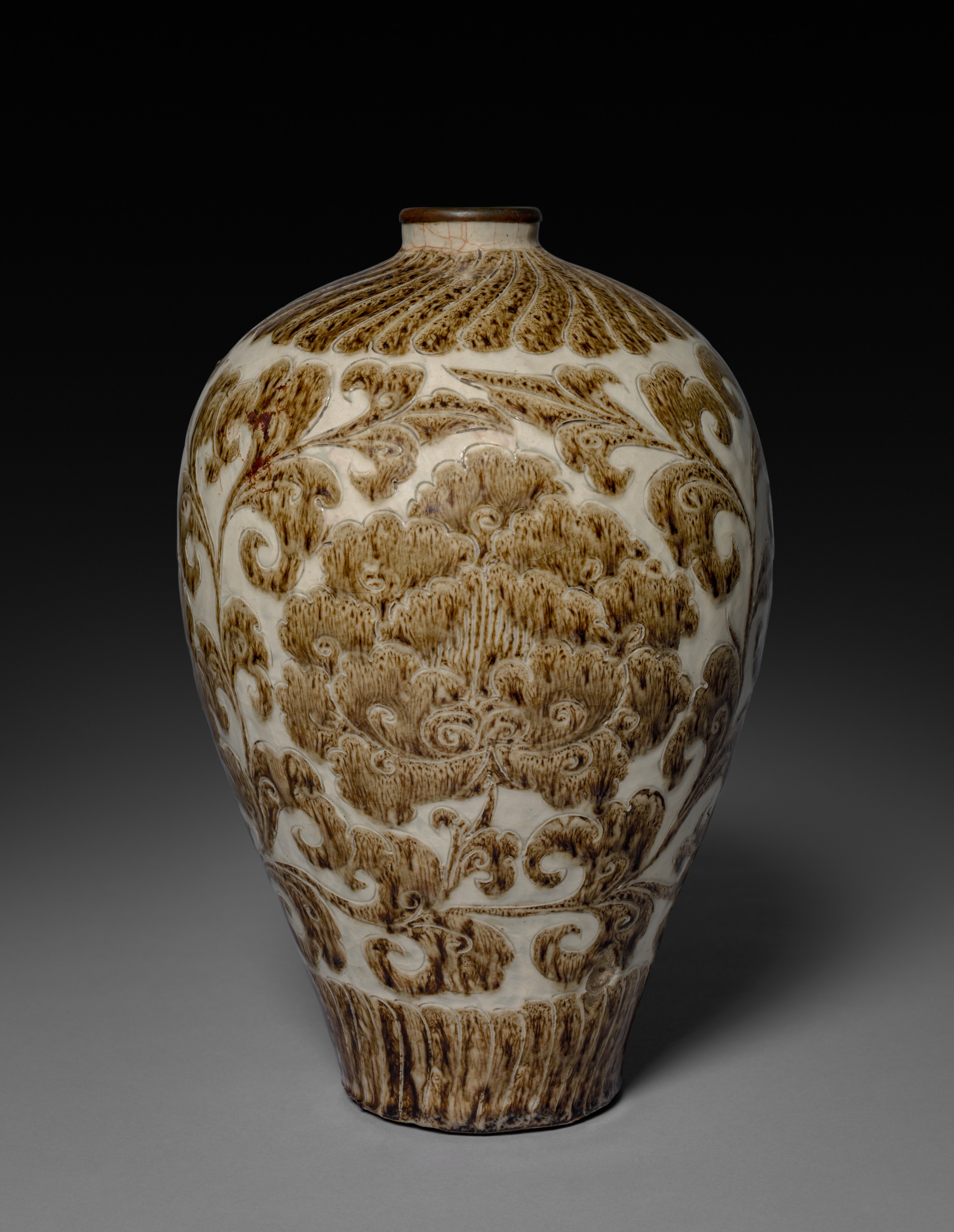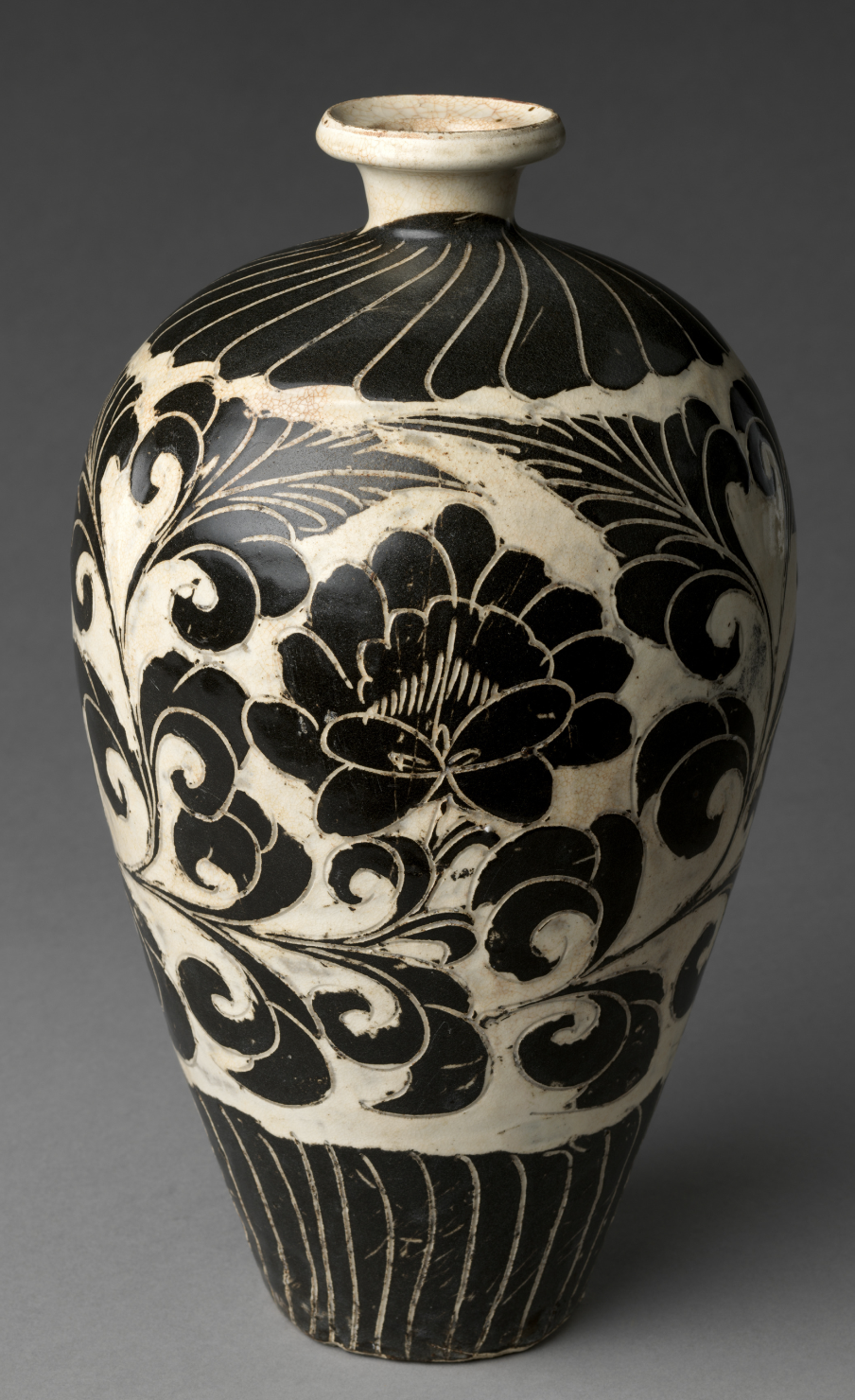 - 器物与材质:牡丹纹瓶,灰色石质胎,白化妆土上作刻划与黑色装饰,属 Cizhou ware