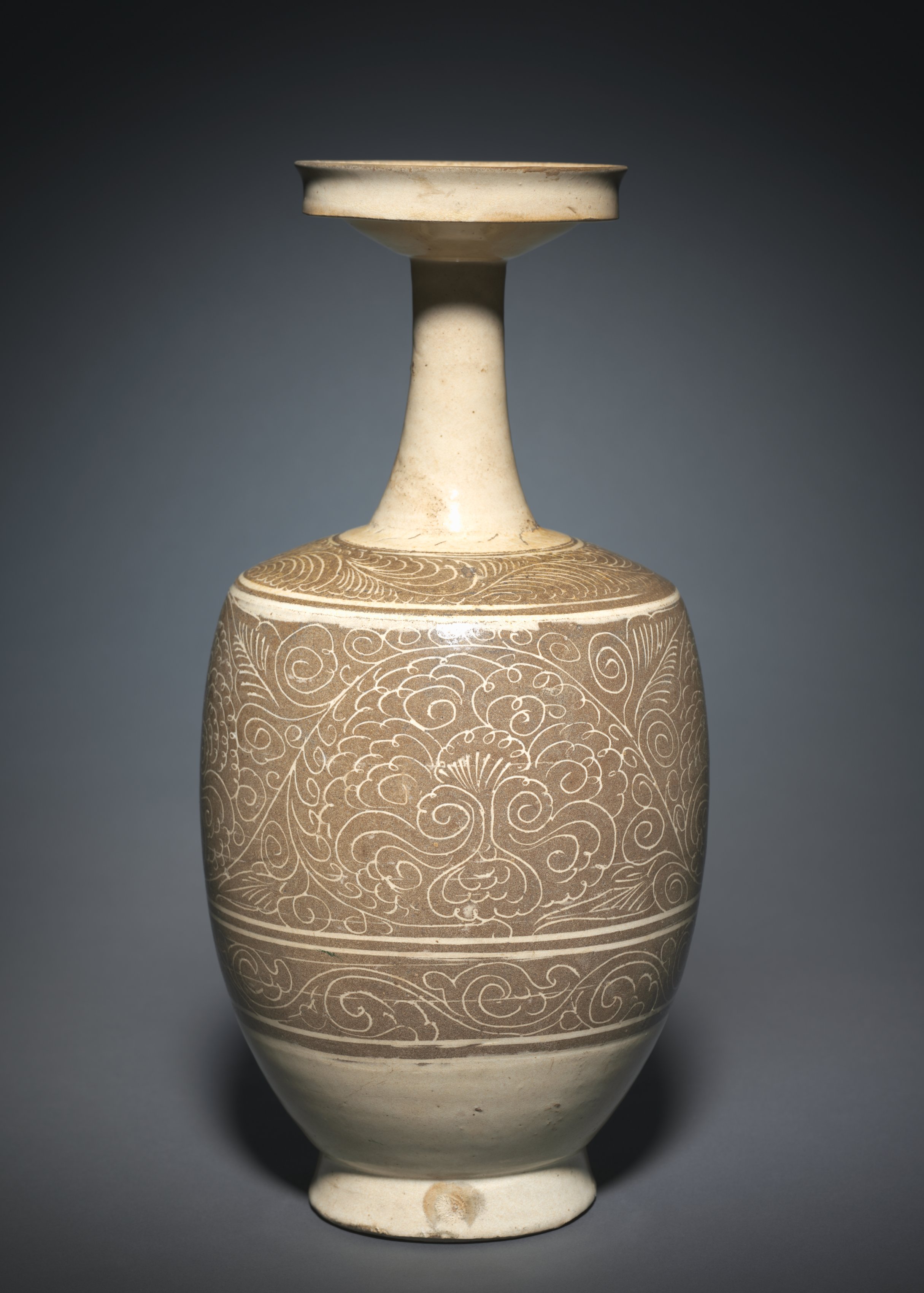 - 器物类型与材质:花卉纹长颈瓶,石质胎,上覆化妆土并以刻划+象嵌方式装饰,属 Cizhou ware