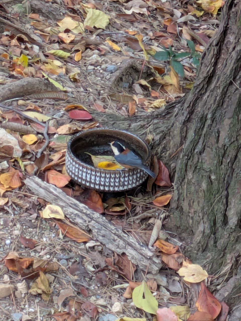 松树下喝水的杂色山雀(Sittiparus varius)。