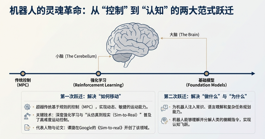 14:21 大脑与小脑的进化:从强化学习解决运动控制,到基座模型注入常识,以及数据共享打破壁垒的重要性。