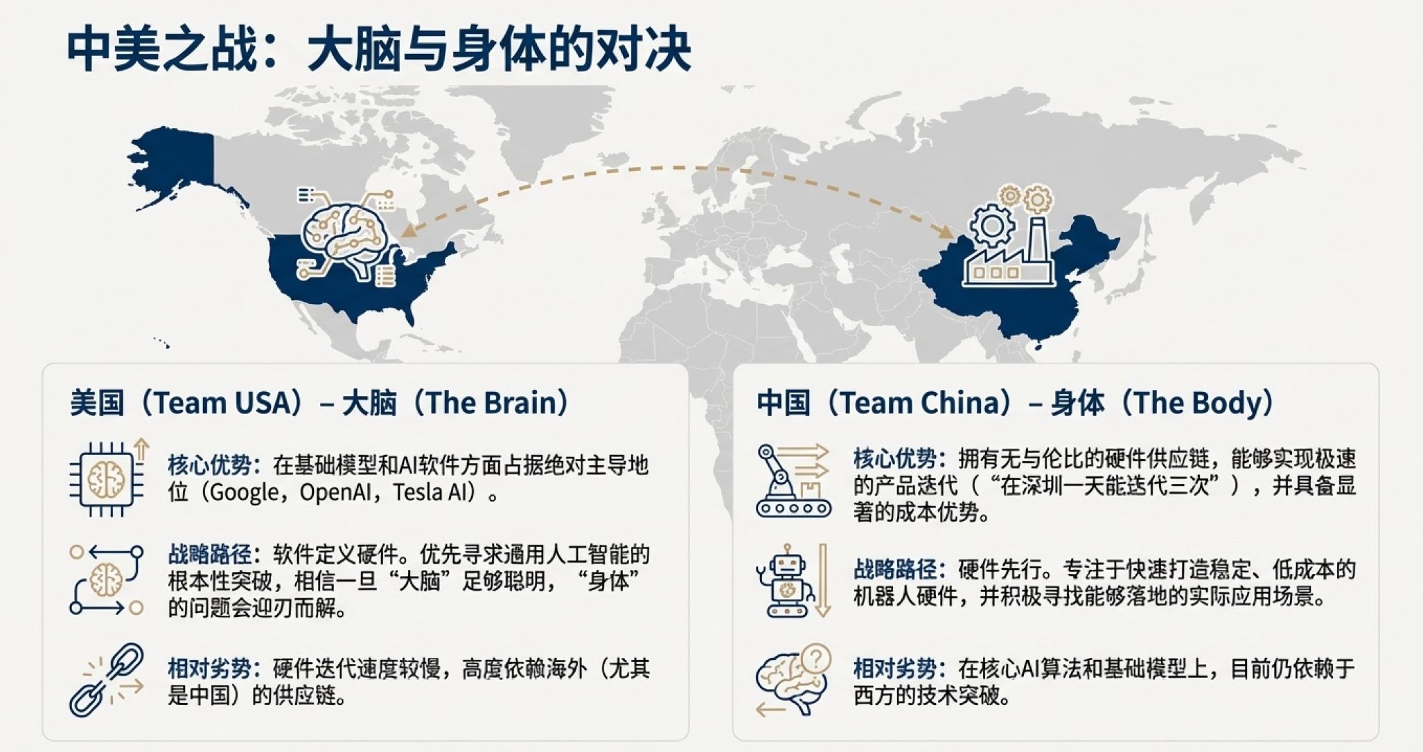 31:14 中美博弈格局:中国拥有极致效率的硬件供应链与快速迭代能力,美国则掌握最强的算法与大脑创新。
