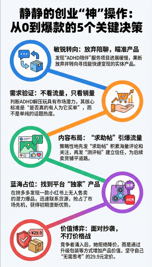 📝 本期简介: 欢迎来到《从零到一用AI》。但这期咱们不聊AI。 在这个所有人都试图用 AI 提高效率、甚至因此感到焦虑的时代,我们邀请到了一位“反其道而行之”的嘉宾——静静。作为一名心理学专业的应届毕业生,她在 Gap Year 期间,仅仅凭借敏锐的商业嗅觉、共情的文案和超强的执行力,在小红书上把一款名为“专注豆”的解压玩具做成了爆款。