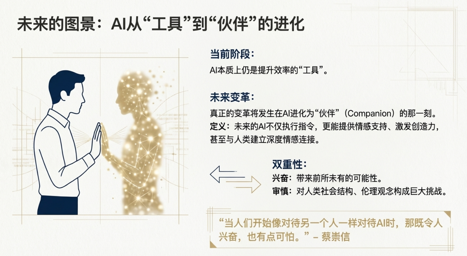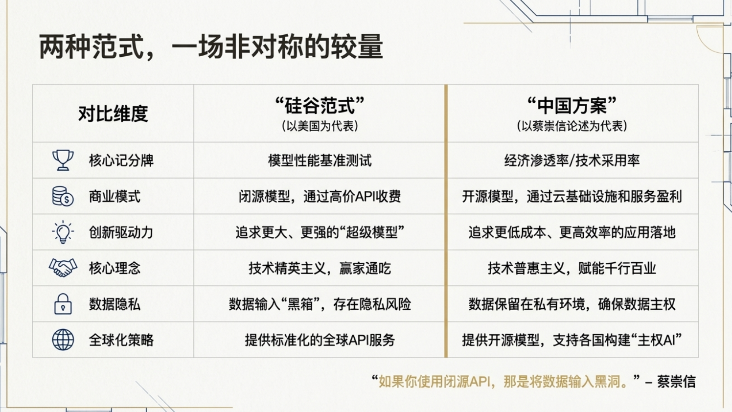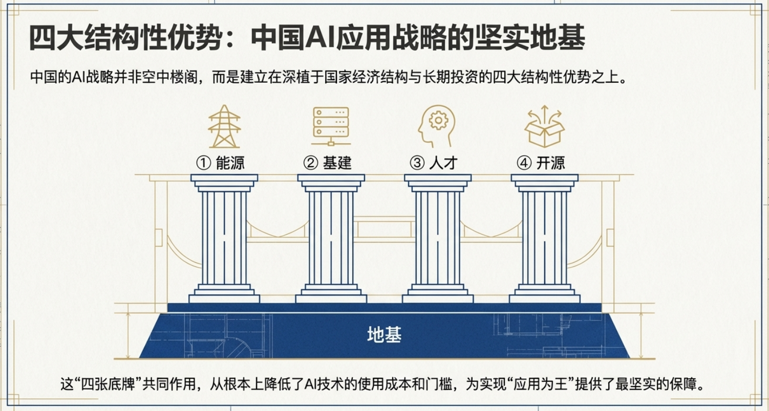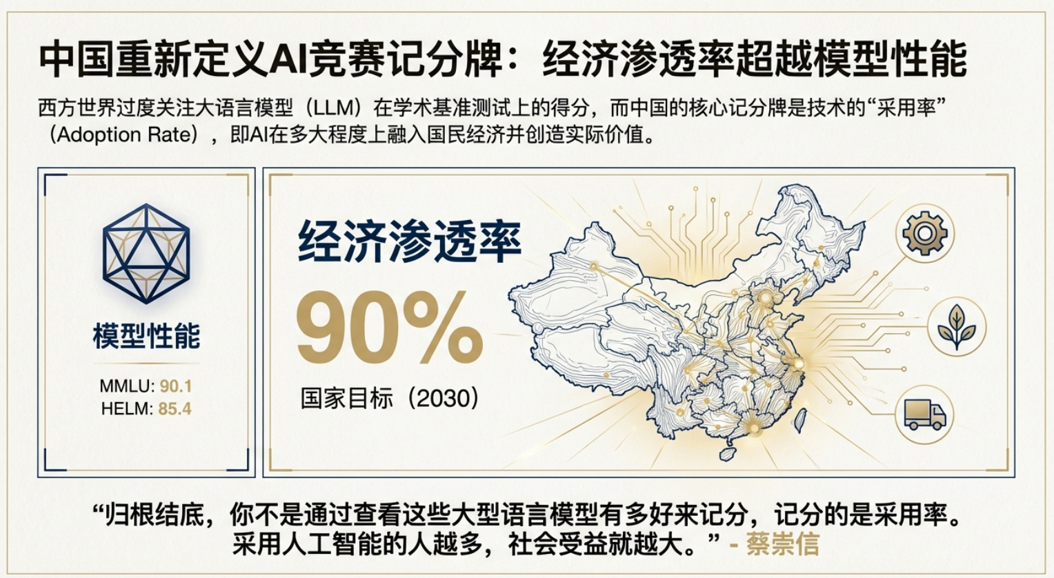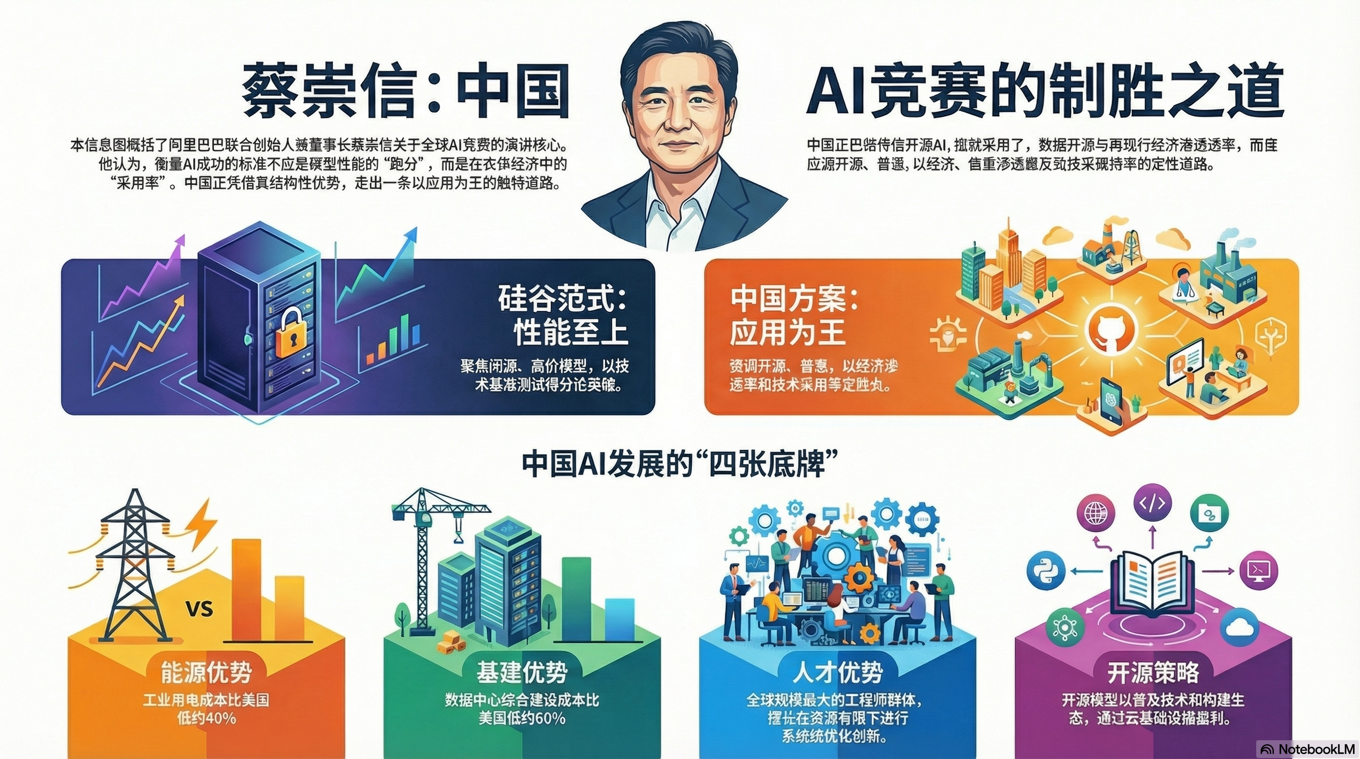 阿里巴巴集团董事长蔡崇信近日于香港大学发表的演讲,系统性地阐述了中国在人工智能(AI)时代的独特发展路径、结构性优势以及未来十年的经济增长动力。蔡崇信的核心论点是,中美AI竞赛的评判标准正在发生根本性转变,中国正凭借其独特的“非对称”优势,走上一条以“应用为王”和“经济渗透率”为核心的道路。如果希望领取PPT版本访谈内容+原始访谈视频,可加微信bonewe2004或关注微信公众号:力力说AI+职场关于主播:加入听友群,请扫二维码