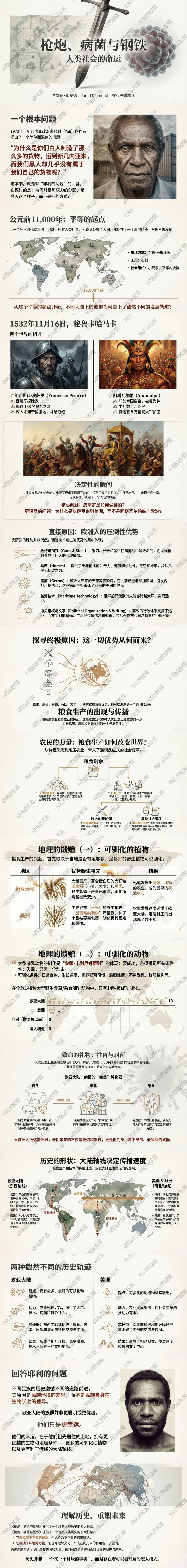 1. 历史差异的根源: 为什么在上一次冰期结束后的 13,000 年间,欧亚大陆的民族发展成了拥有金属工具、文字和工业化的社会,而其他地区却未能实现同样的发展。