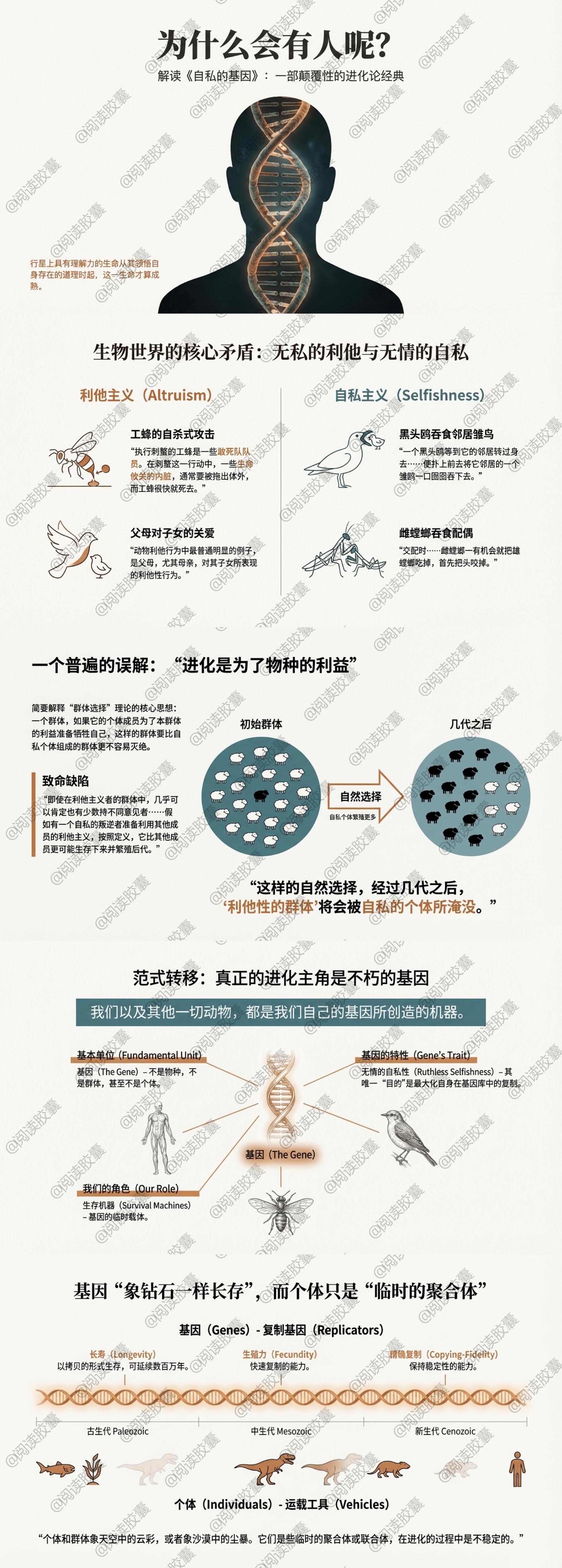 1. 道德与事实的分离: 作者强调他描述的是事物如何进化(事实),而不是人类应该如何行动才符合道德准则(道德)。他认为,一个以基因自私性法则为基础的人类社会将会“令人厌恶之极”。