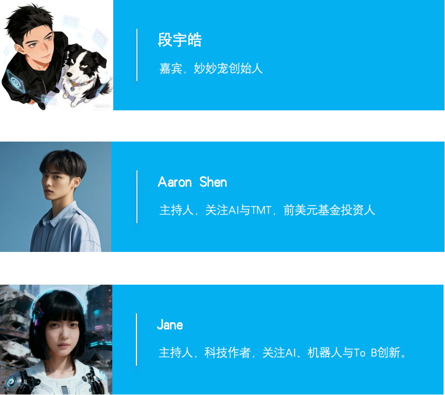 本期节目我们邀请到了宠物智能品牌 「妙妙宠」创始人 段宇皓做客「ya!ya!」,宇皓信奉“创业要趁早”,虽然出生于2001年,但这已经是他的第三个创业项目了。访谈中我们聊到了他先后参与清华智能产业研究院、大疆系创业项目,在李泽湘教授创立的xbotpark孵化过工厂消防机器人和巡检机器人的创业经历,以及这次为何押注to C背后的思考和定位。