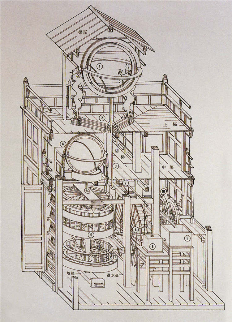 ▲ 李约瑟认为中国的水运仪象台(上图)是欧洲中世纪天文钟的原型