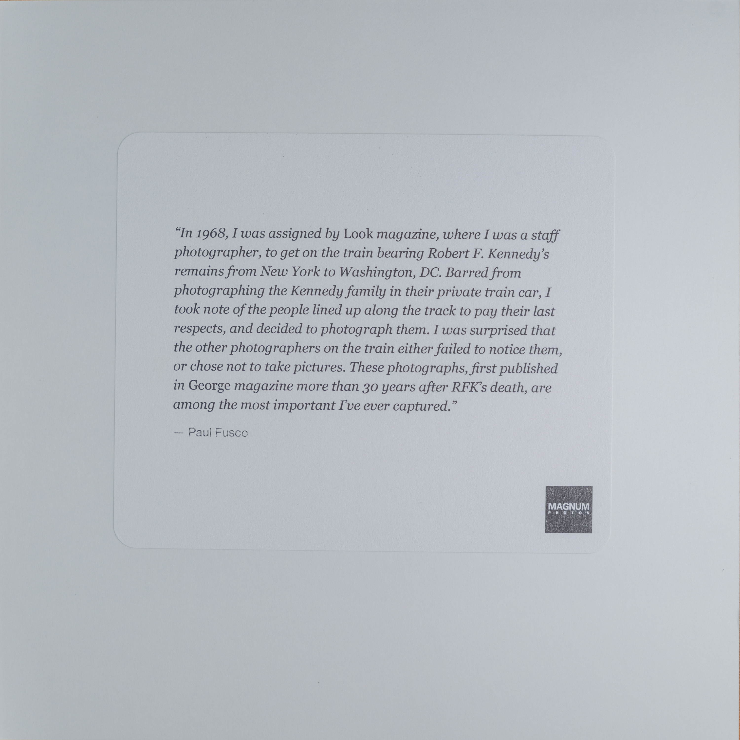 “1968 年,我受雇于《Look》杂志,当时是该刊的签约摄影师,任务是登上运载罗伯特·F·肯尼迪(Robert F. Kennedy)遗体的列车,从纽约前往华盛顿特区。由于不被允许在肯尼迪家族的私人车厢内拍摄,我便开始留意那些沿铁轨排队送别的人们,并决定拍下他们的身影。我惊讶地发现,同车的其他摄影师要么未曾注意这些人,要么选择不拍摄。这组照片,30多年后首次发表于《George》杂志,是我一生中拍摄过最重要的作品之一。”