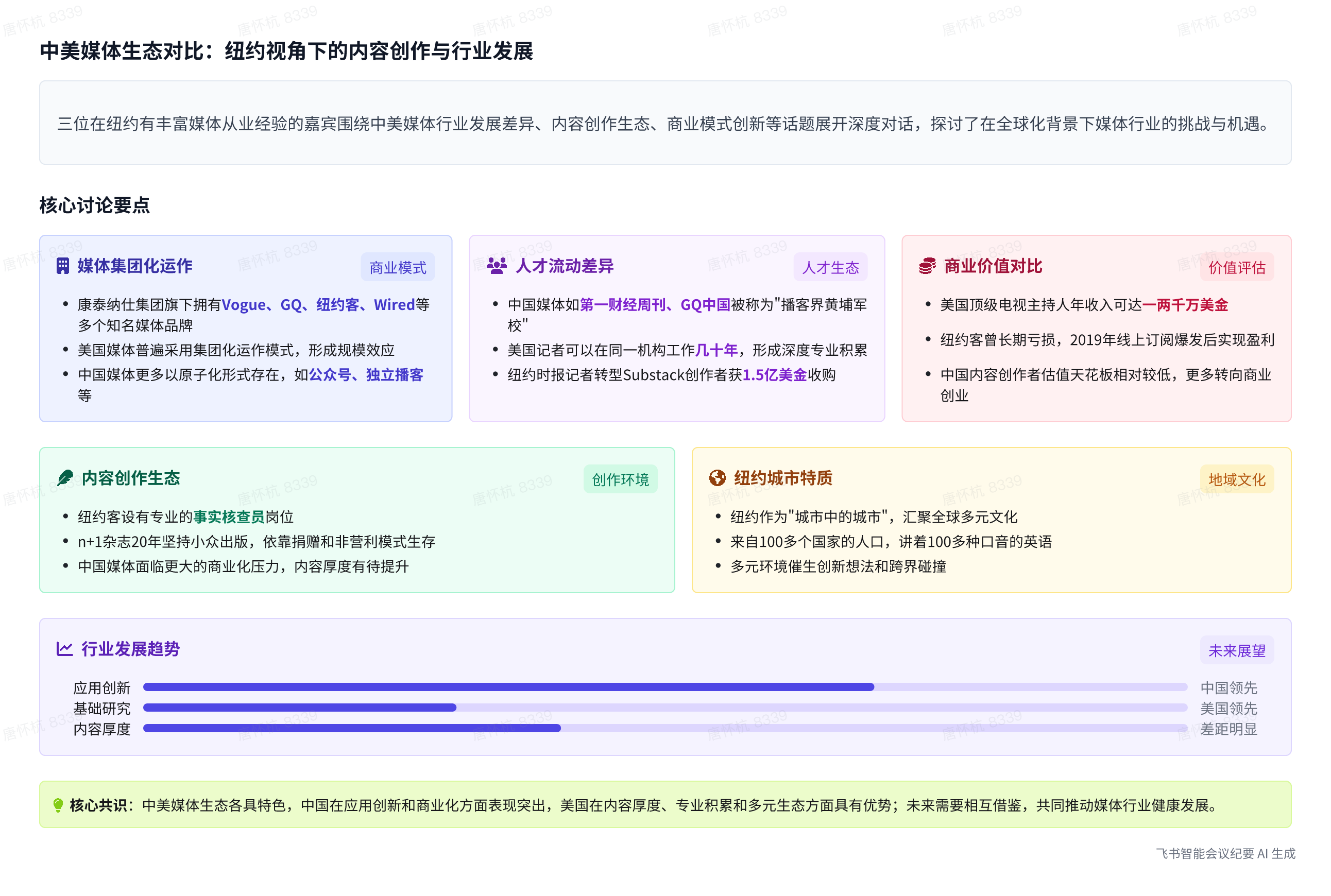 中美在媒体发展上也呈现某种犬牙交错。中国在应用层创新极快——公众号比Substack早,抖音、美团、支付体验让美国人惊叹。但在基础研究、传统媒体的韧性上,美国仍有独特的厚度。“卷都卷,关键卷什么。”某美国大学写论文的第一条就是不能重复他人,逼着年轻人从教育体系里开始卷原创性。