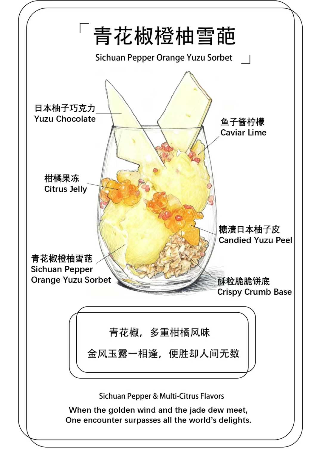 醇厚的巧克力铺开底色,柑曼怡的酒香随即上扬,柑橘的清新提供亮色,而青花椒的清香和微微麻感,将舌尖的体验推上顶点。