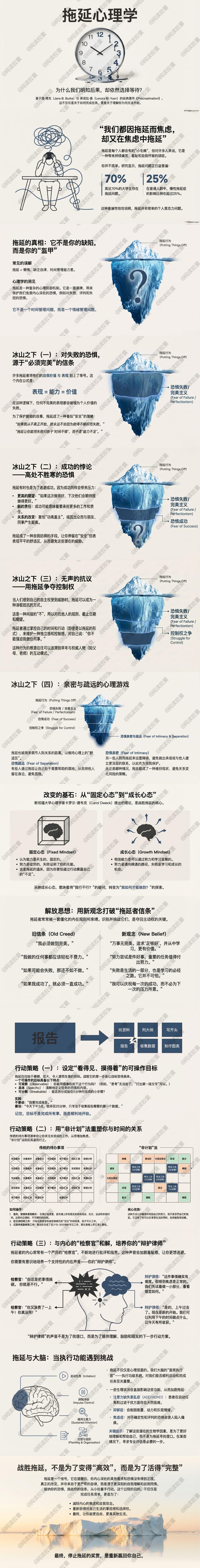 • 内在信念的影响: 拖延者往往怀抱一些僵化的“拖延者的信条” (例如:“我必须完美”、“我做的任何事都应该轻松不费力”、“我必须避免挑战”),这些信条使他们害怕失败或成功,从而阻碍了发展。